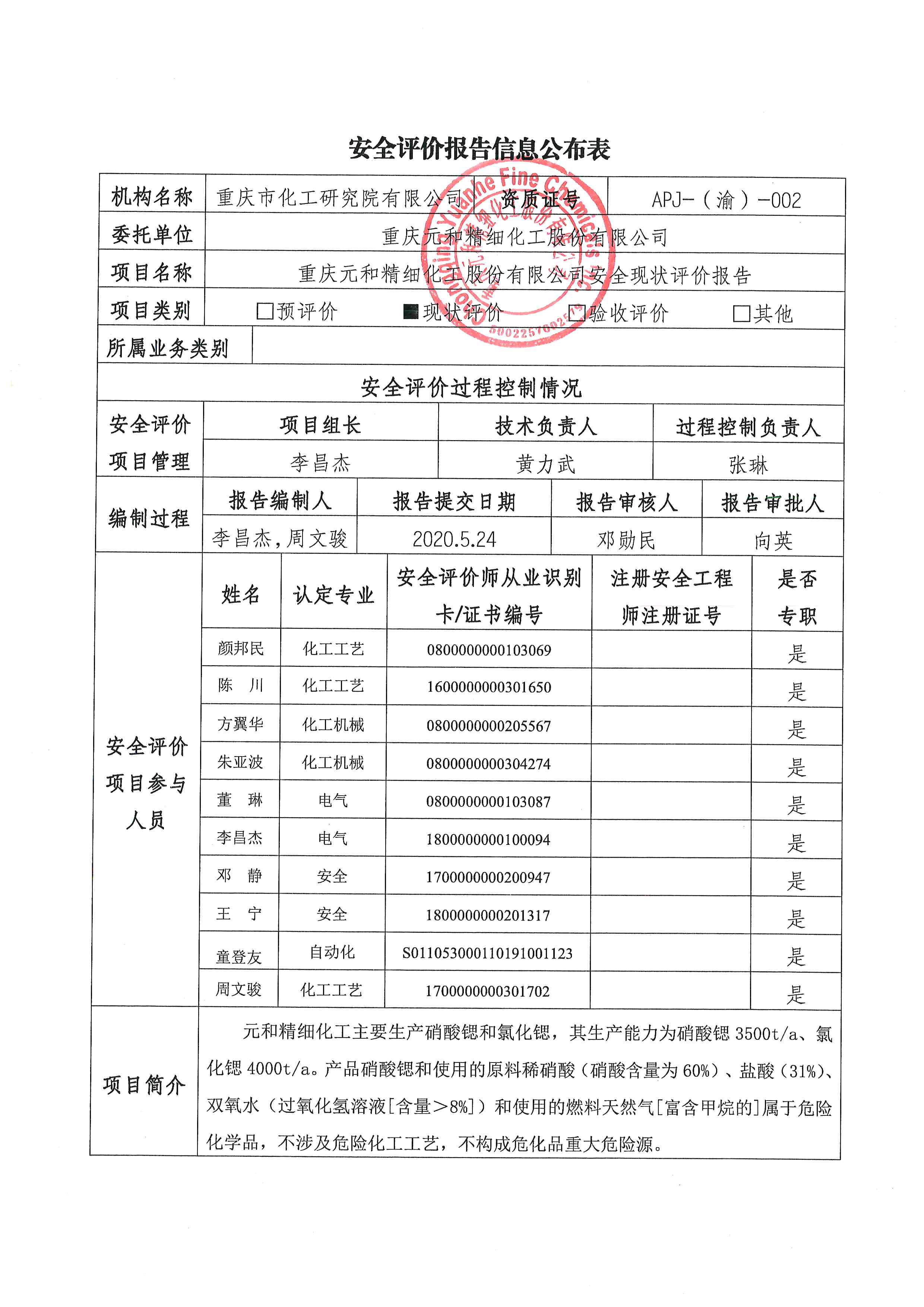 2021年第2季度重庆元和精细化工股份有限公司安全现状评价-信息公布表