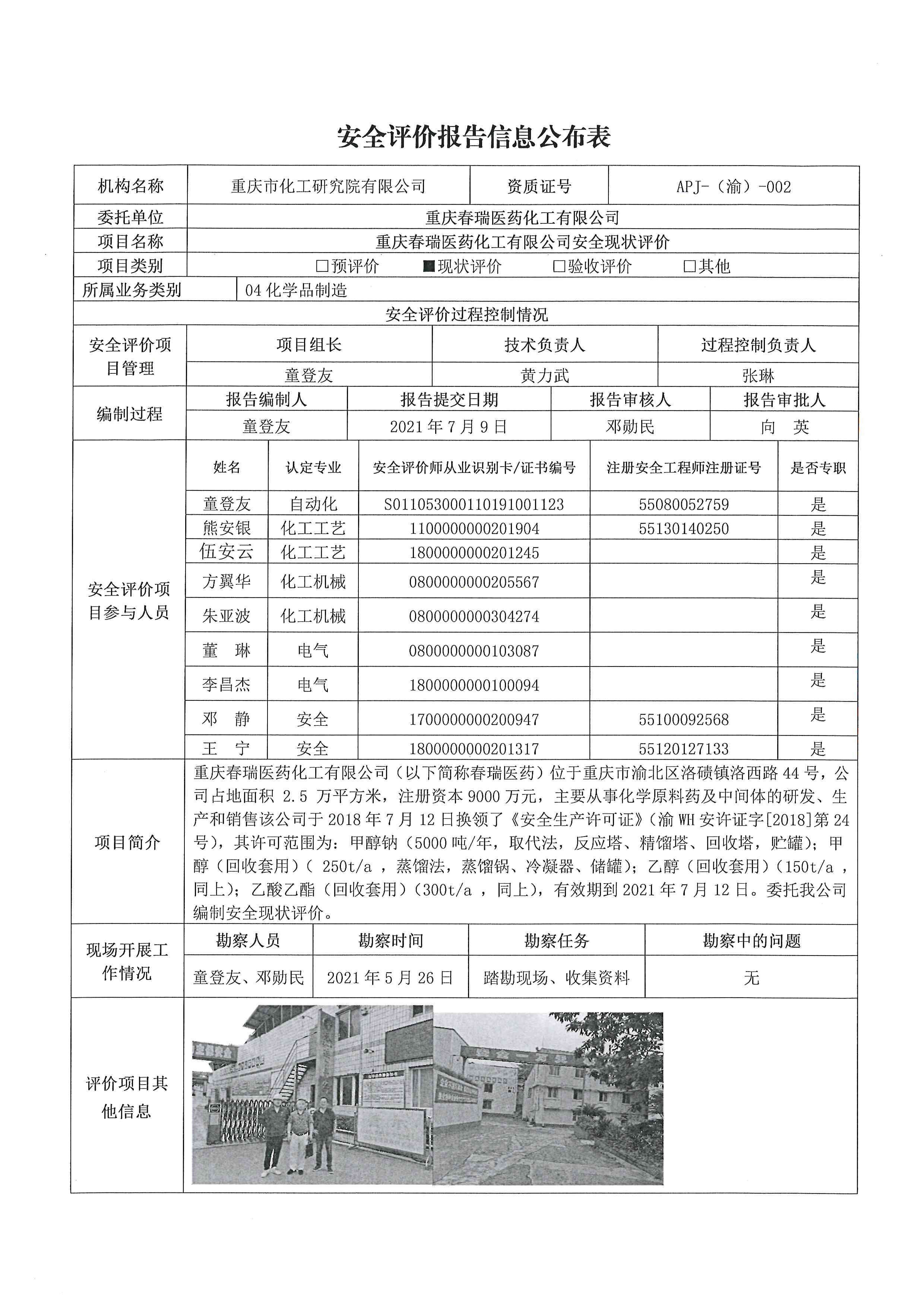 2021年第3季度 春瑞医药化工有限公司 安全现状评价-信息公布表