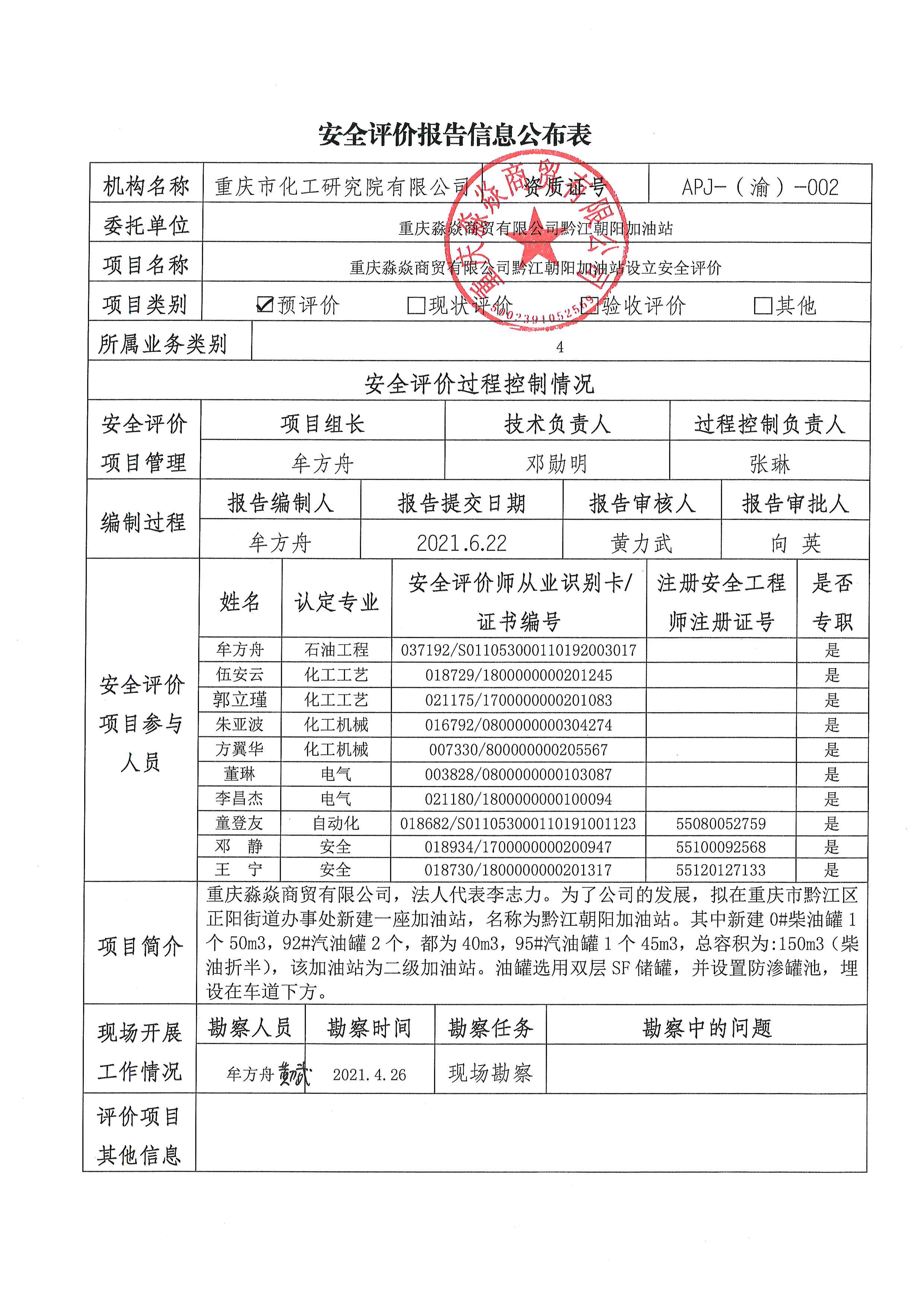 2021年第3季度 淼淼商贸有限公司黔江朝阳加油站 设立安全评价-信息公布表