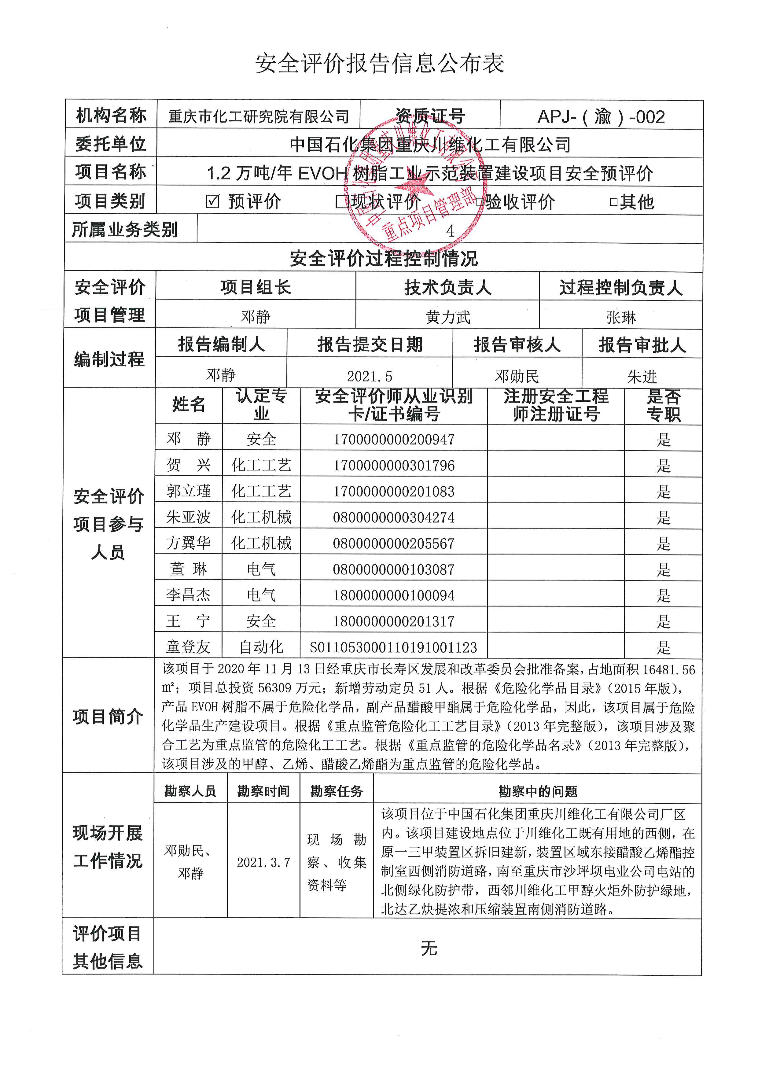2021年第3季度 中国石化集团重庆川维化工有限公司1.2万吨年EVOH树脂工业示范装置建设项目 设立安全评价-信息公布表