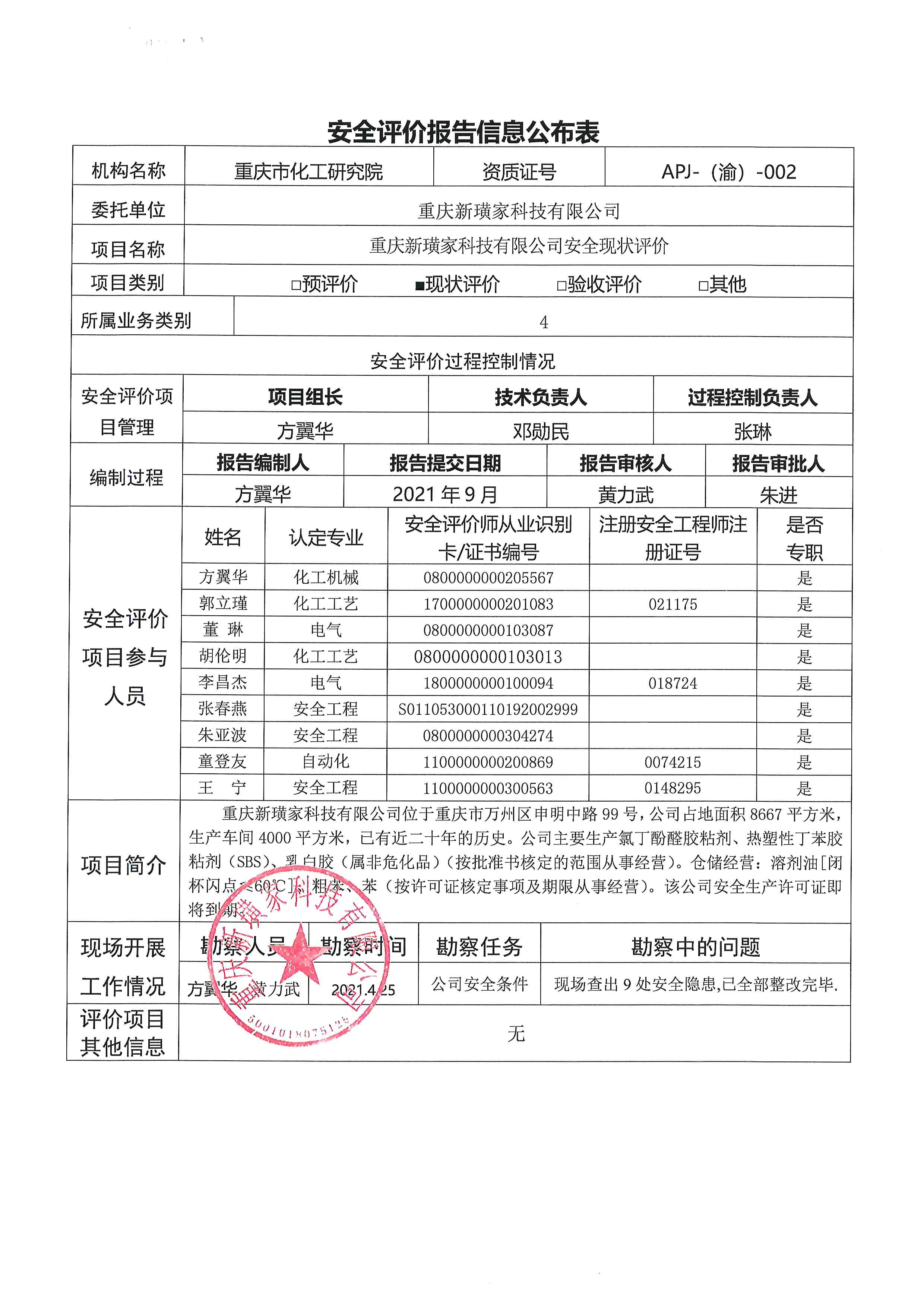 2021年第3季度 重庆新璜家科技有限公司 安全现状评价-信息公布表