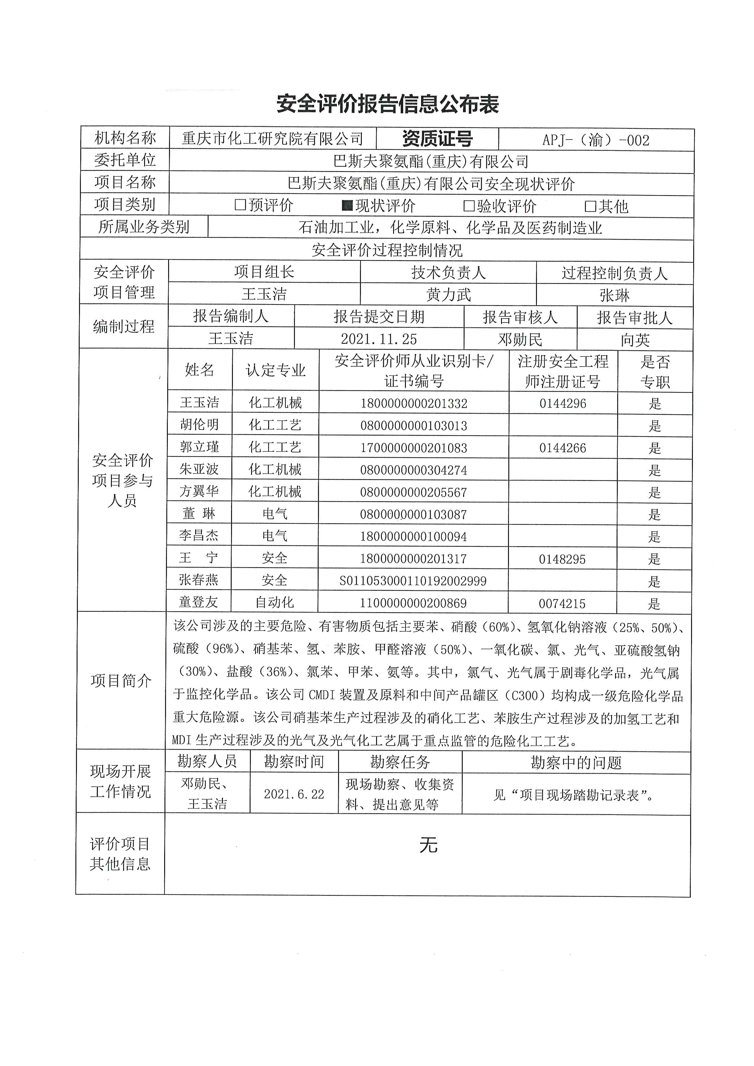 2021年第4季度 巴斯夫聚氨酯(重庆)有限公司安全现状评价-信息公布表