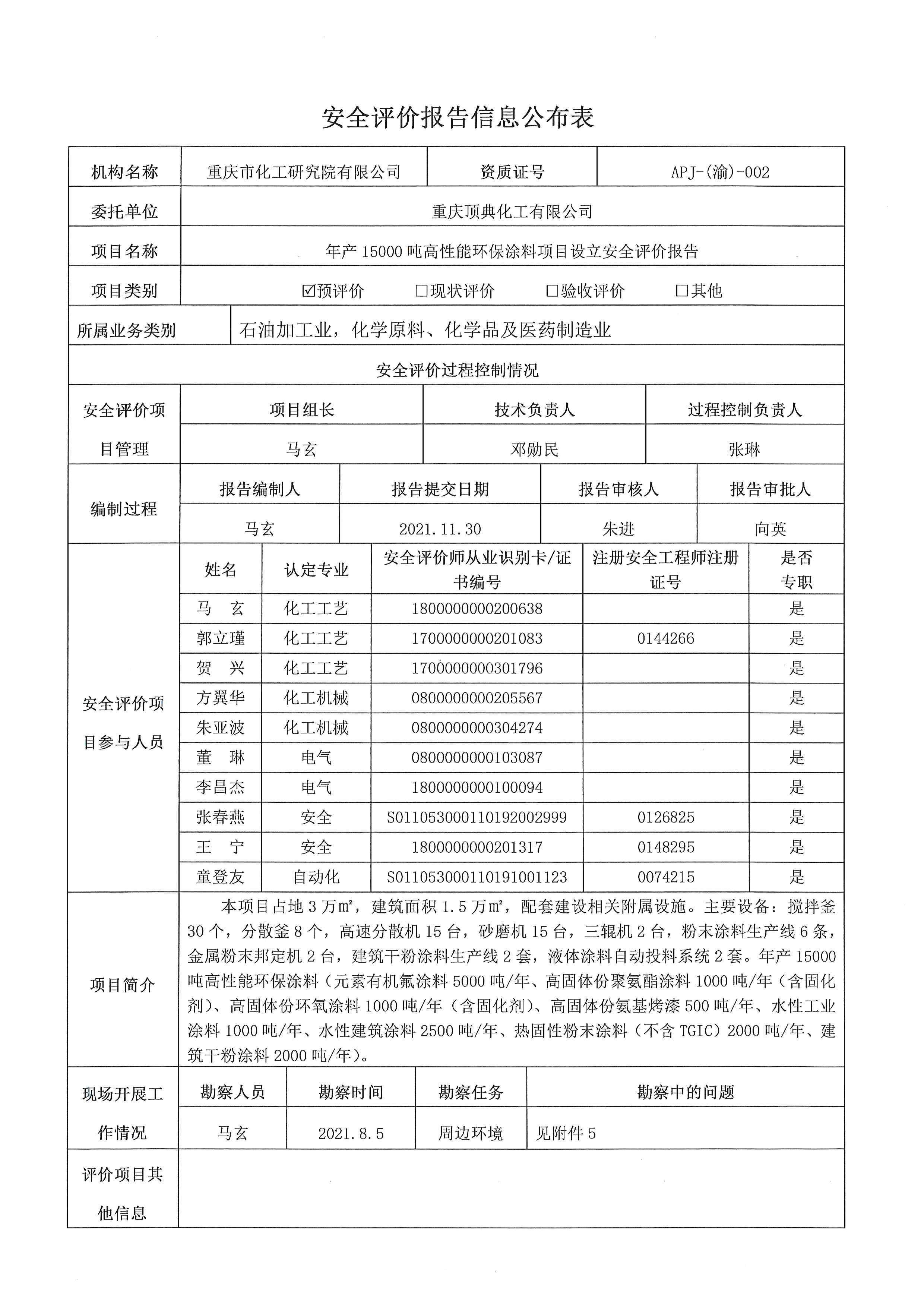 2021年第4季度 重庆顶典化工有限公司年产15000吨高性能环保涂料项目设立安全评价-信息公布表