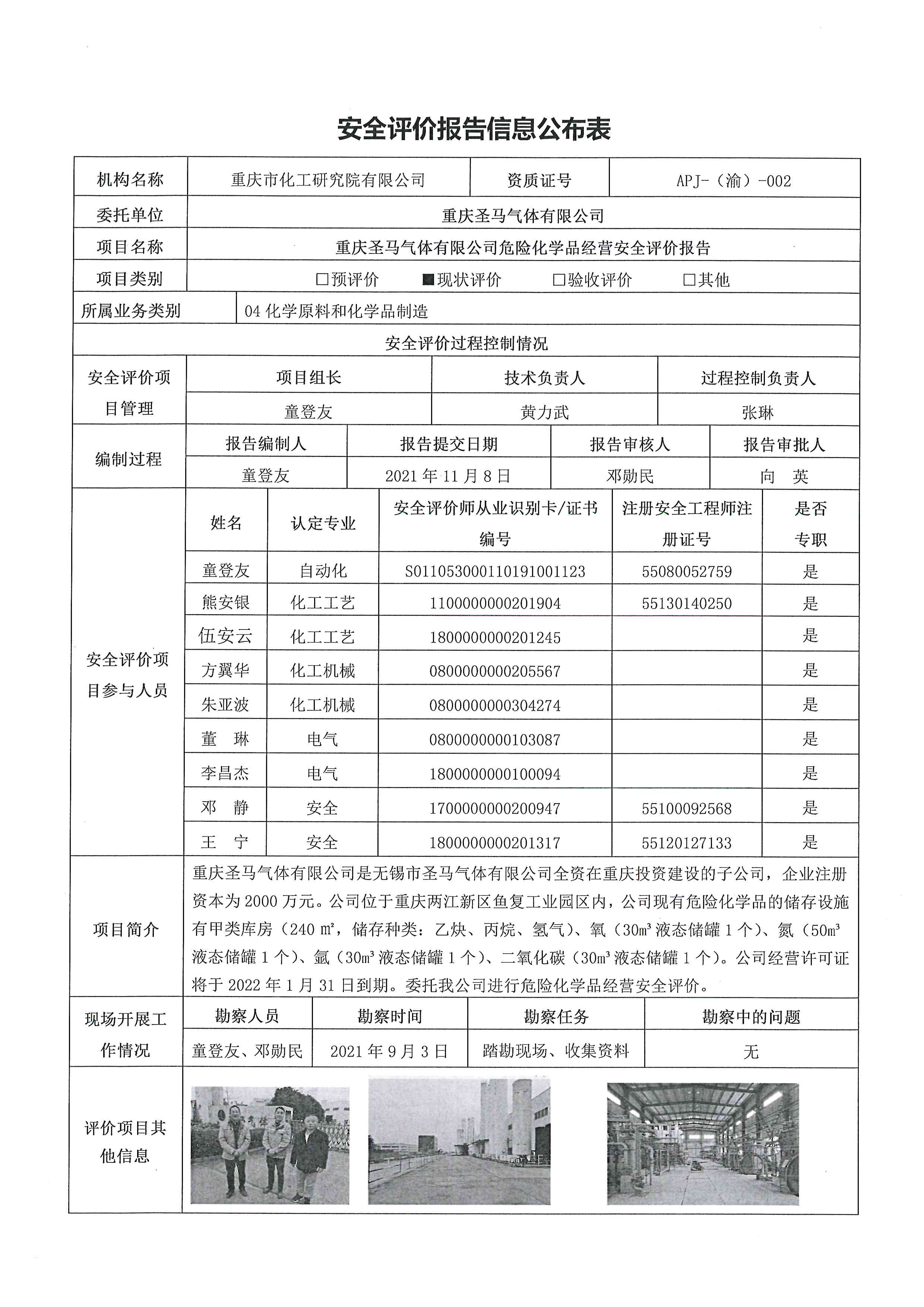 2021年第4季度 重庆圣马气体有限公司危险化学品经营安全现状评价-信息公布表