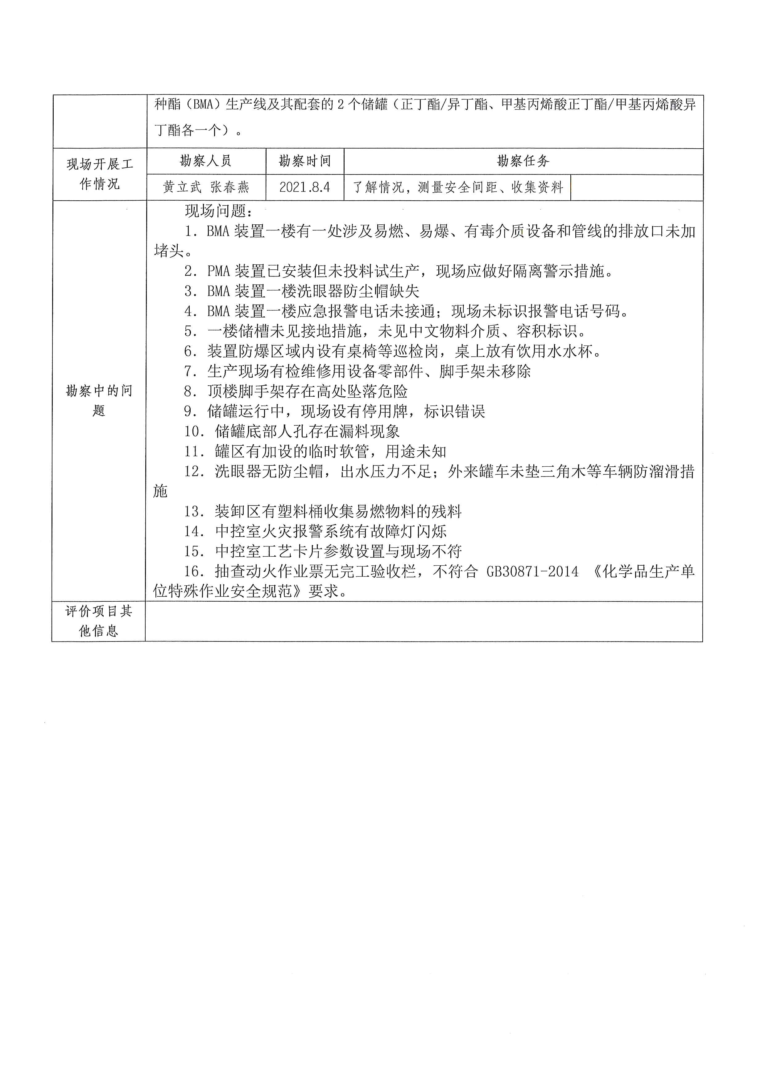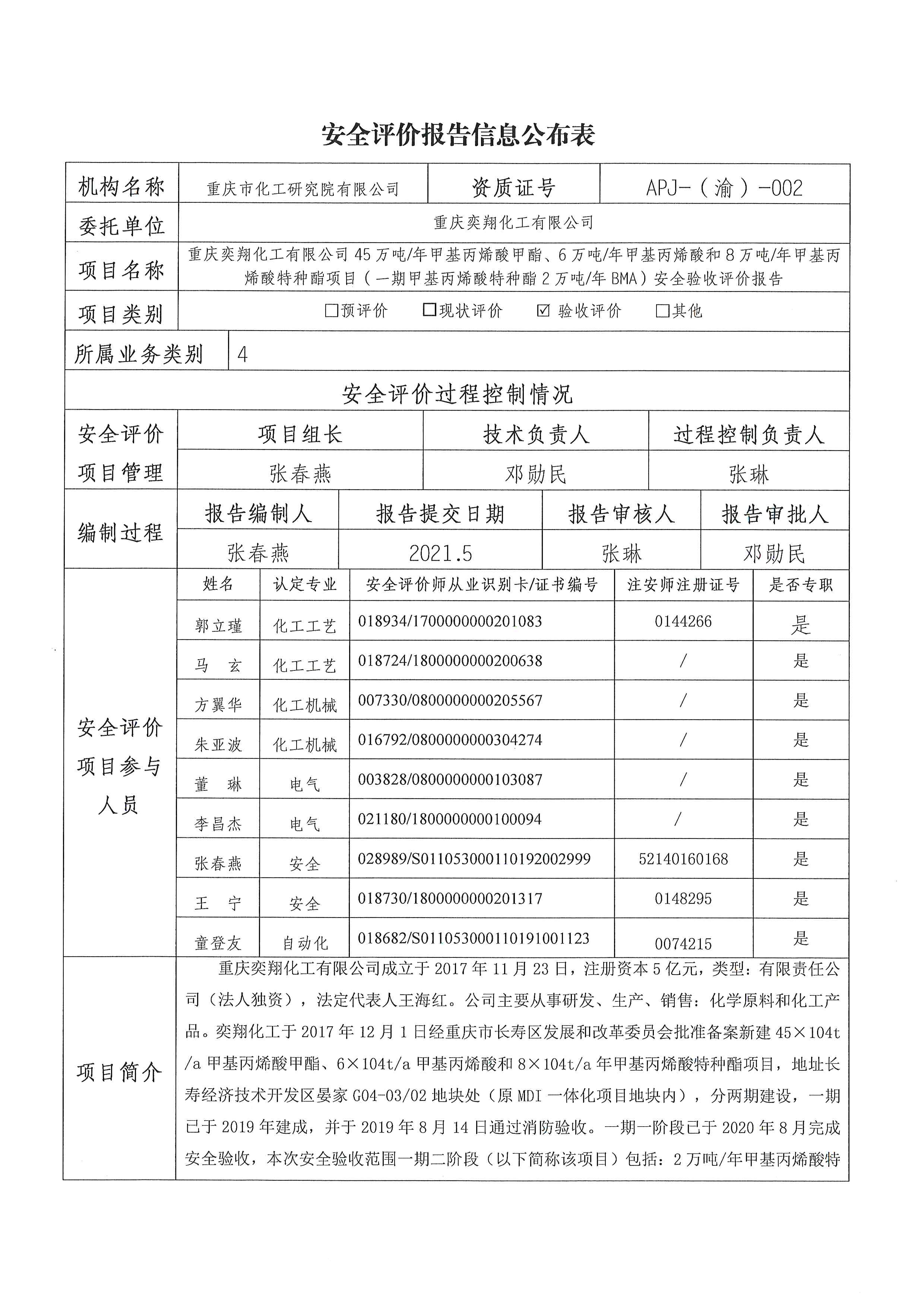 2021年第4季度 重庆奕翔化工有限公司45万吨每年甲基丙烯酸甲酯、6万吨每年甲基丙烯酸和8万吨每年甲基丙烯酸特种酯项目(一期甲基丙烯酸特种酯2万吨每年BMA)安全验收评价-信息公布表