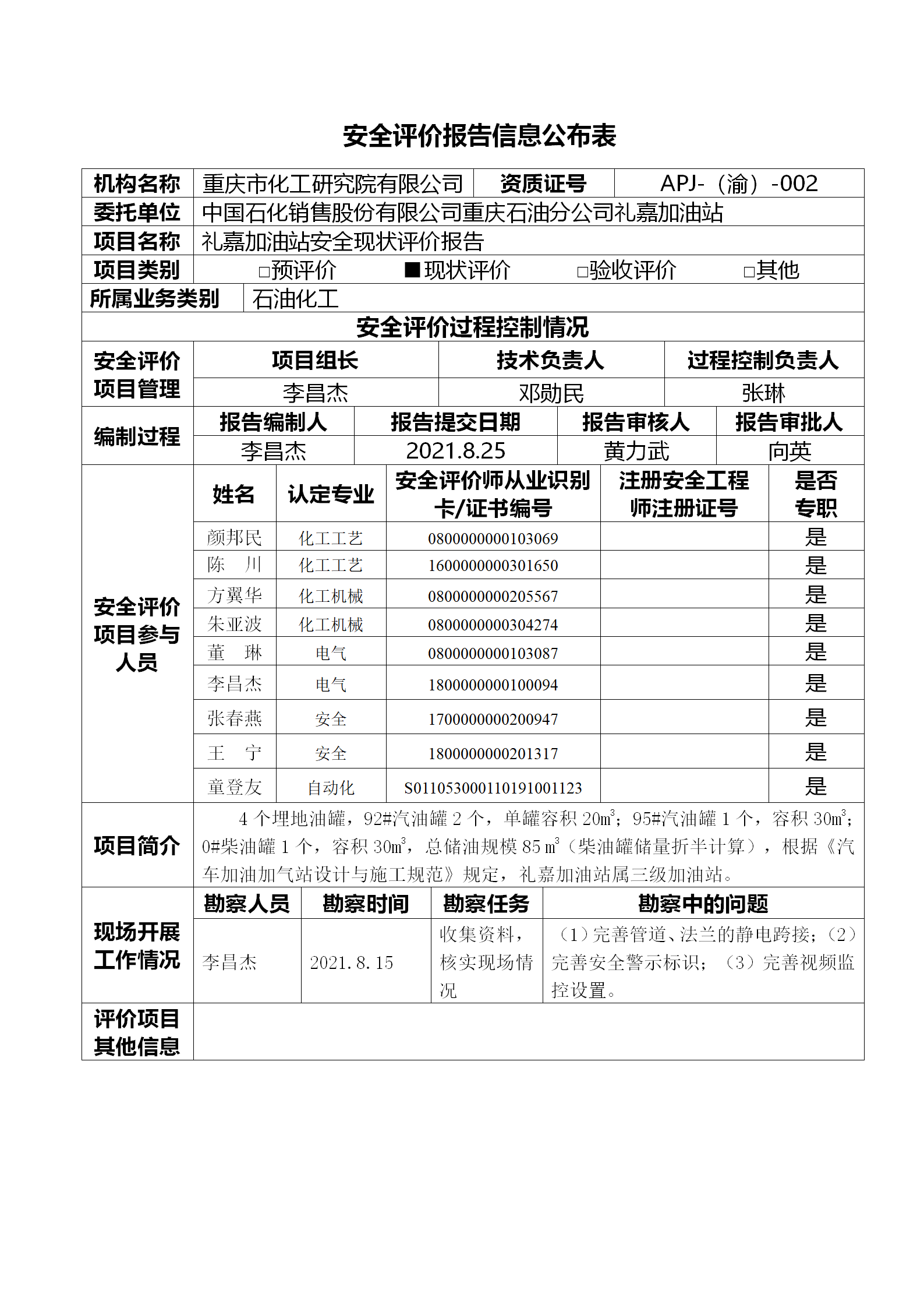 2021年第4季度 中国石化销售股份有限公司重庆石油分公司礼嘉加油站安全现状评价-信息公示表