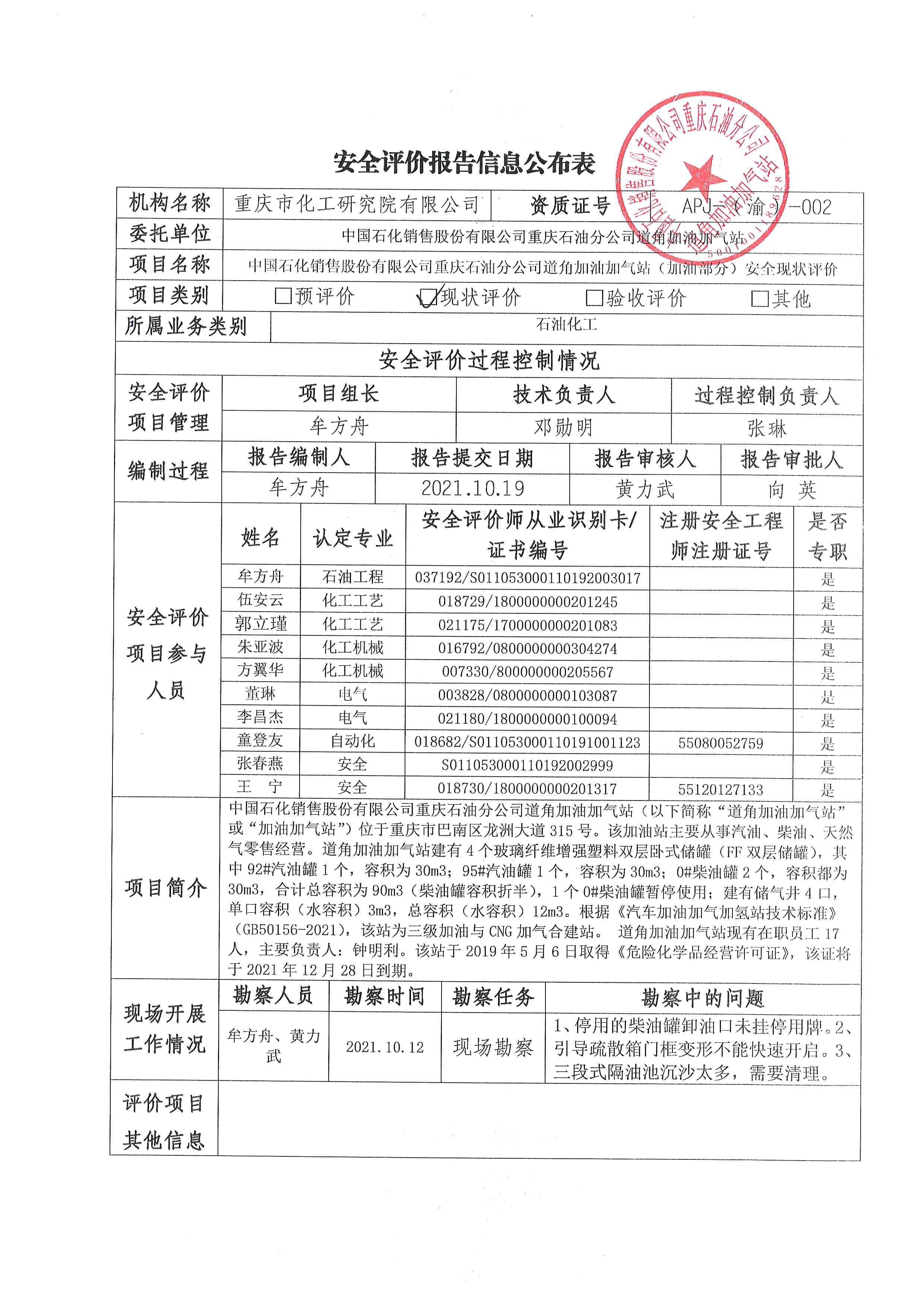2021年第4季度 中国石化销售股份有限公司重庆石油分公司道角加油加气站(加油部分)安全现状评价-信息公示表