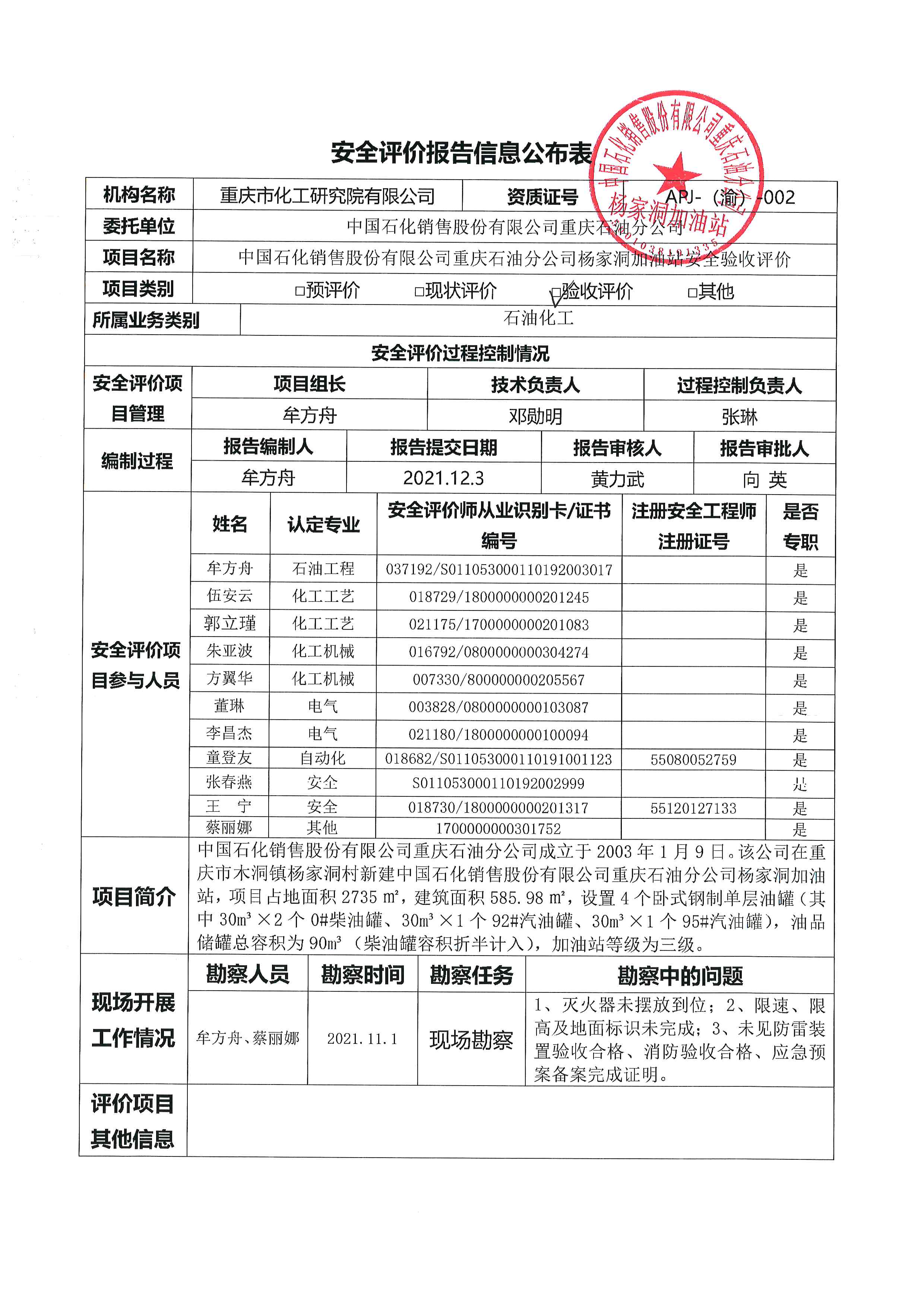 2021年第4季度 中国石化销售股份有限公司重庆石油分公司杨家洞加油站安全验收评价-信息公示表