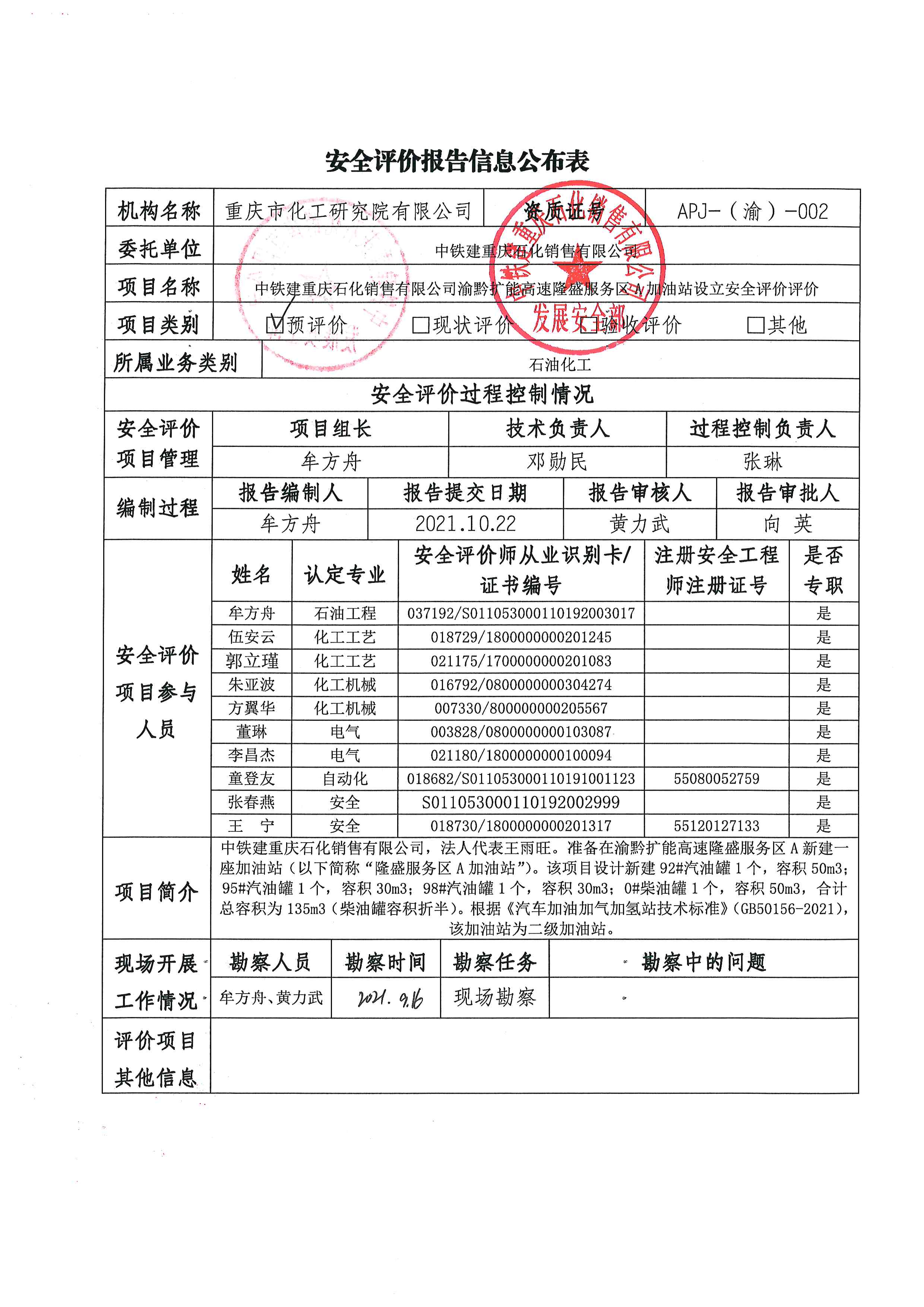 2021年第4季度 中铁建重庆石化销售有限公司渝黔扩能高速隆盛服务区A加油站设立安全评价-信息公示表