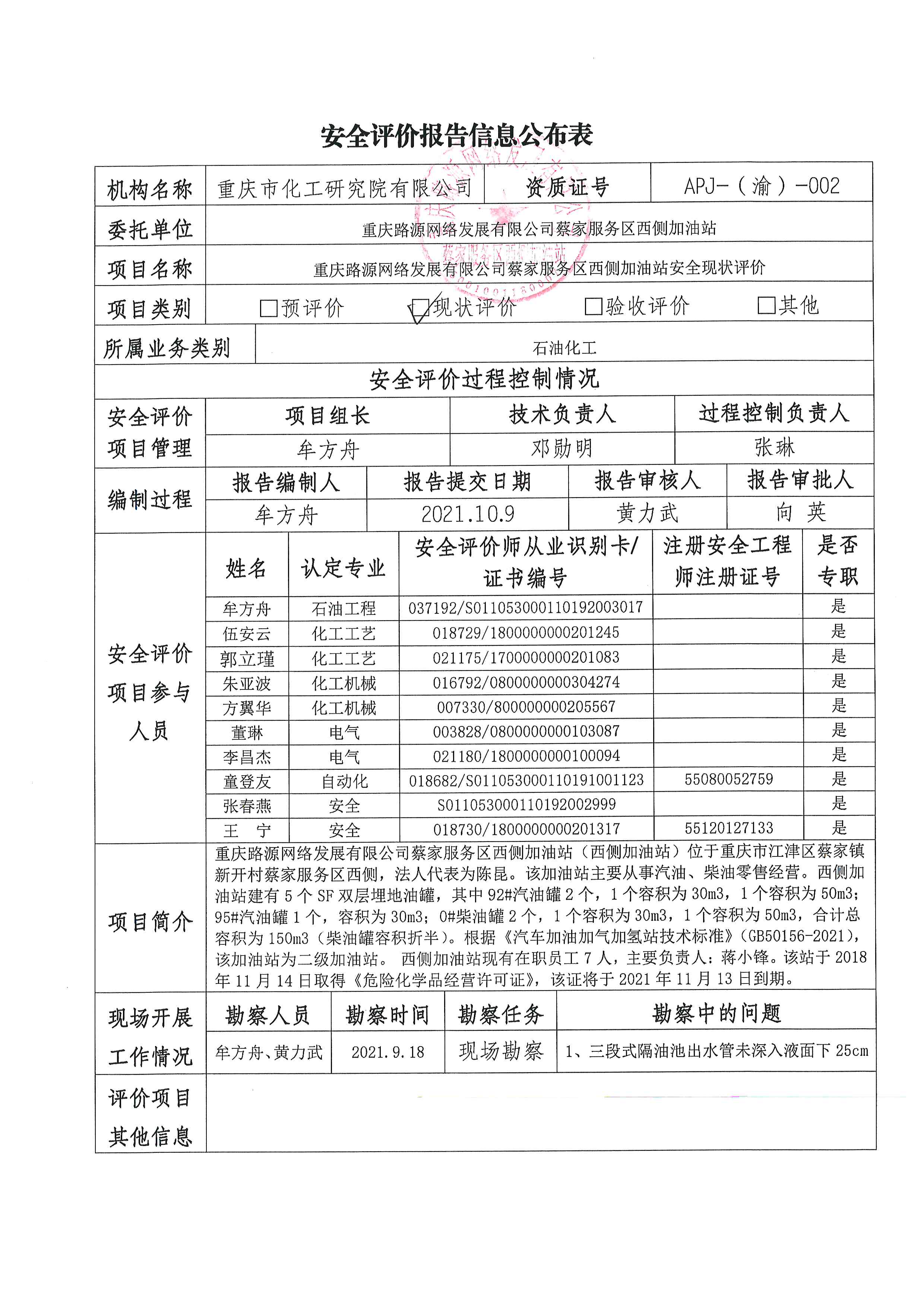 2021年第4季度 重庆路源网络发展有限公司蔡家服务区西侧加油站安全现状评价-信息公示表