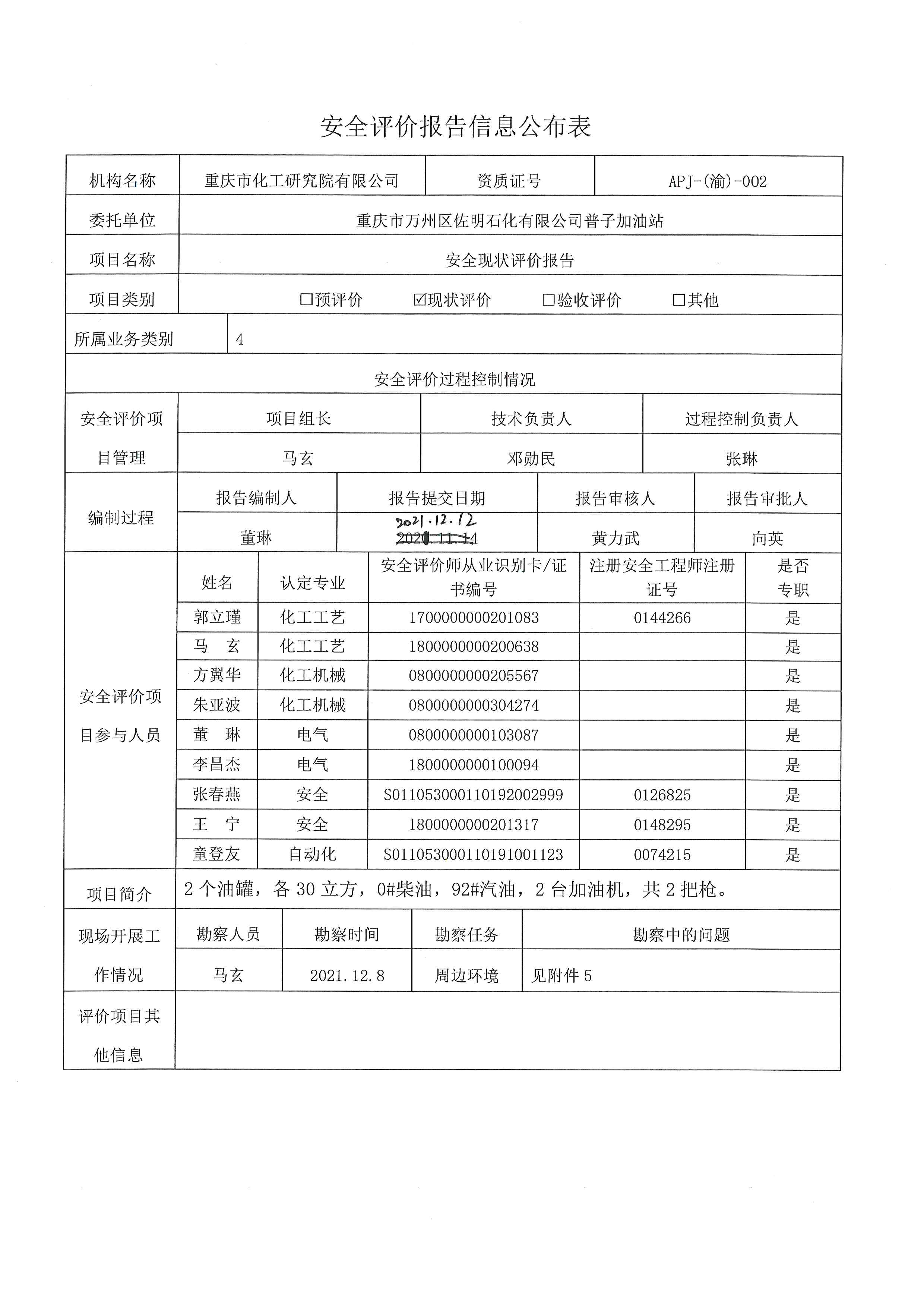 2021年第4季度 重庆市万州区佐明石化有限公司普子加油站安全现状评价-信息公示表