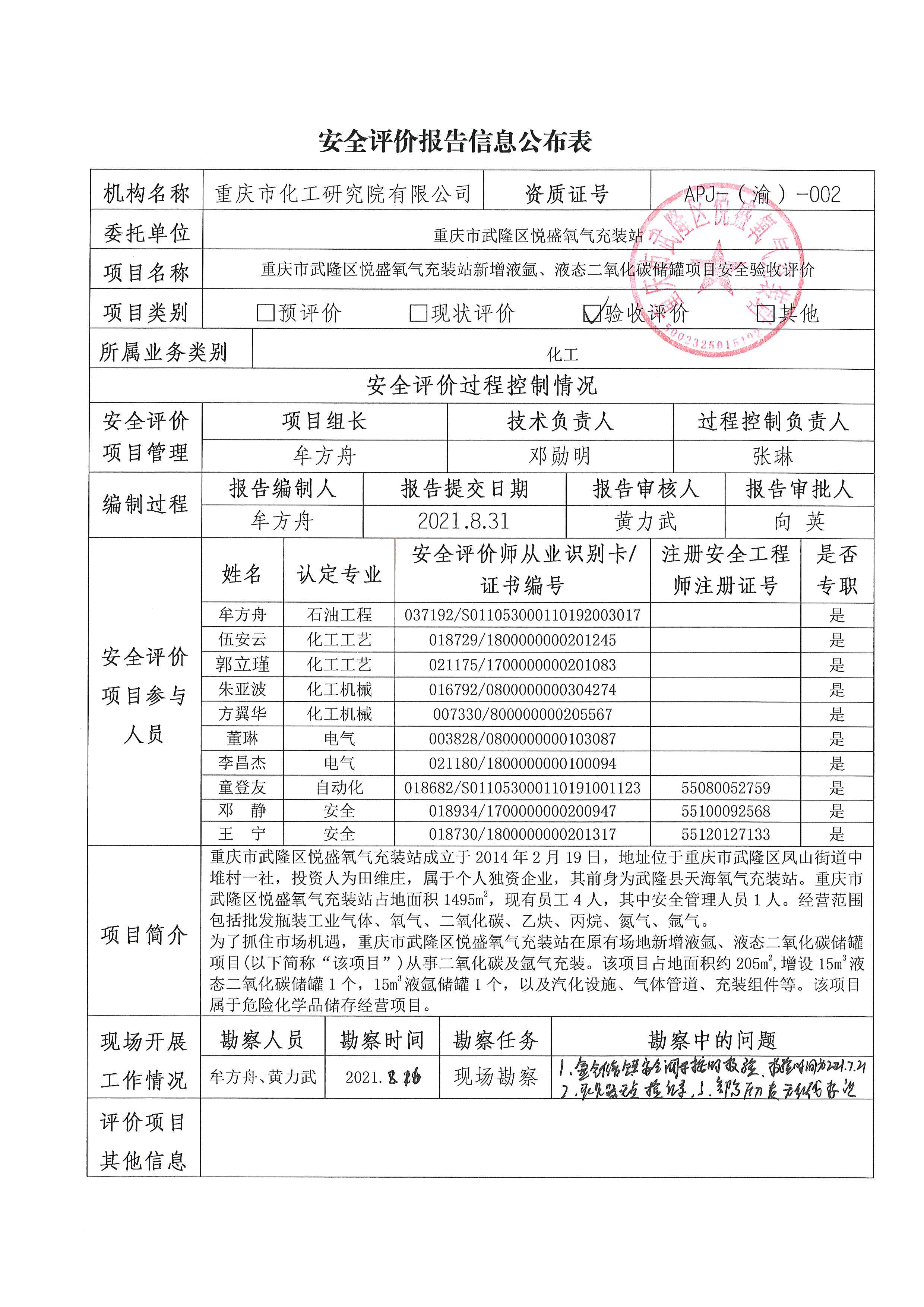 2021年第4季度 重庆市武隆区悦盛氧气充装站新增液氩、液态二氧化碳储罐项目安全验收评价-信息公示表
