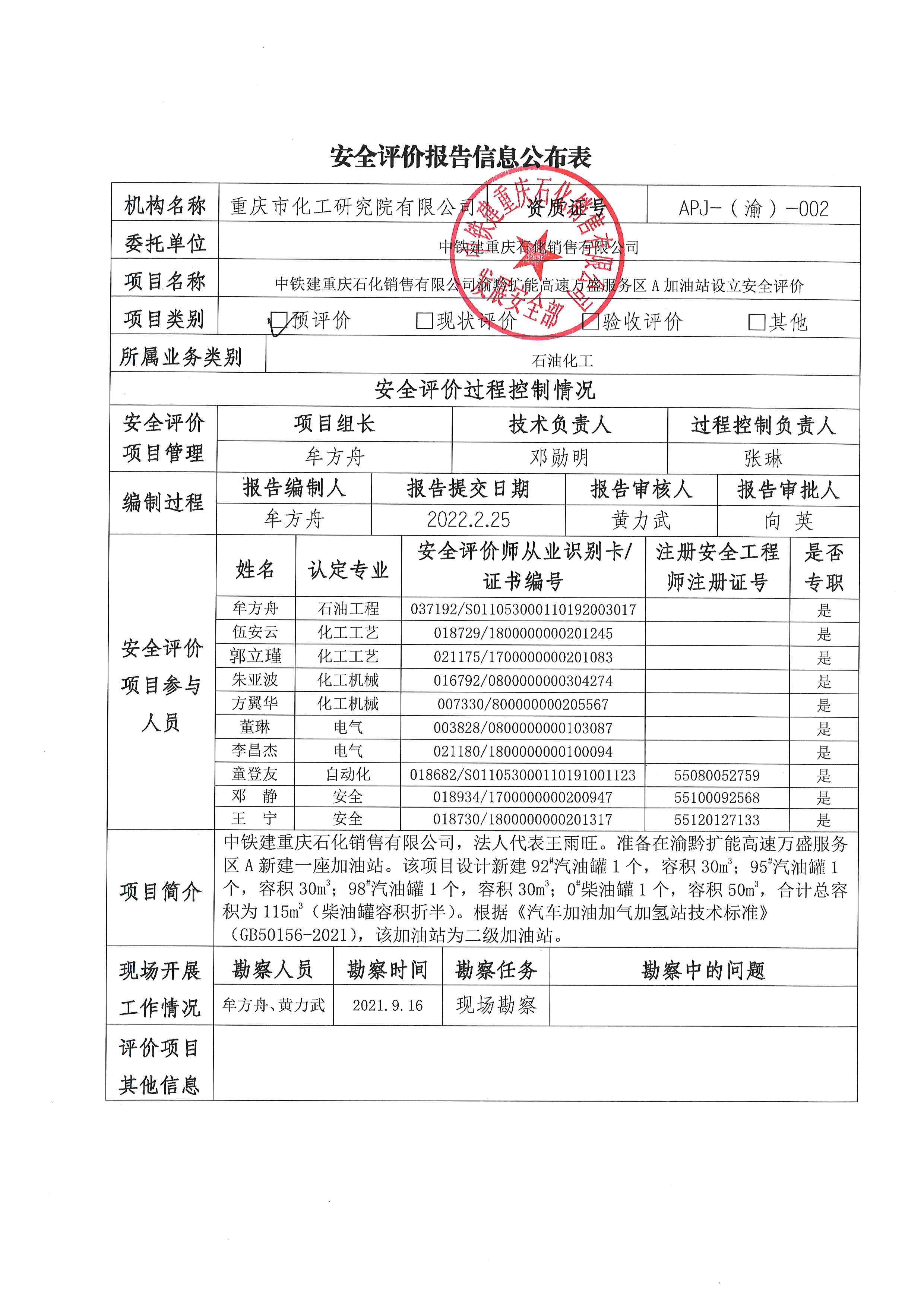 2022年第1季度 中铁建重庆石化销售有限公司渝黔扩能高速万盛服务区A加油站设立安全评价-信息公布表
