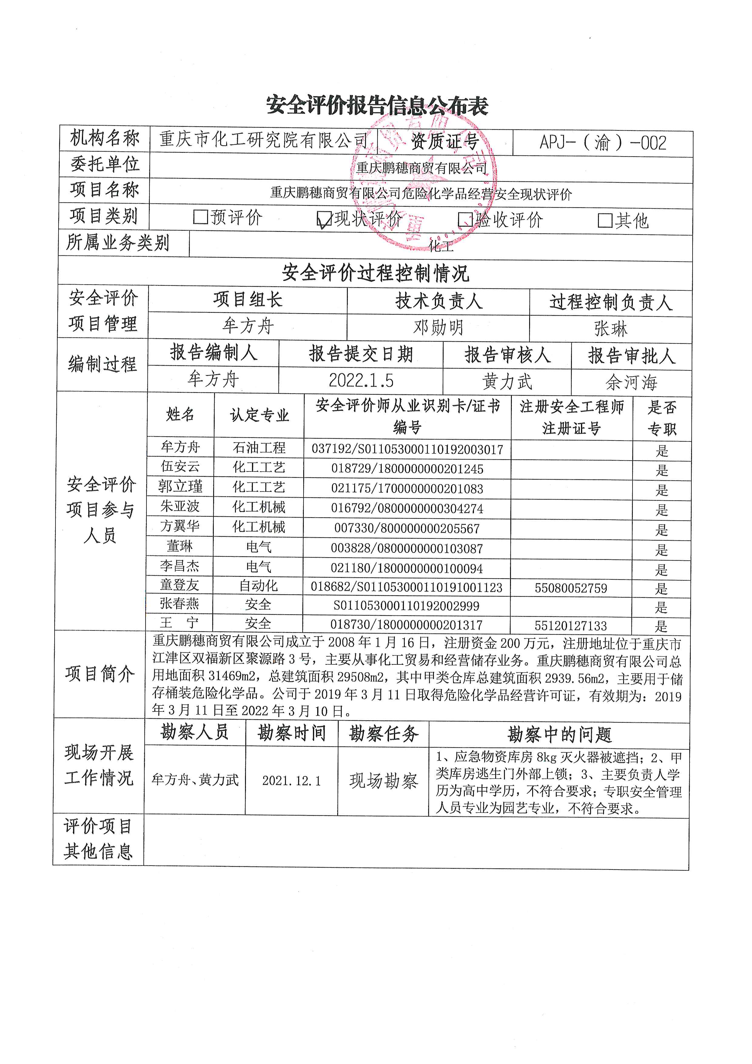2022年第1季度 重庆鹏穗商贸有限公司危险化学品经营安全现状评价-信息公布表
