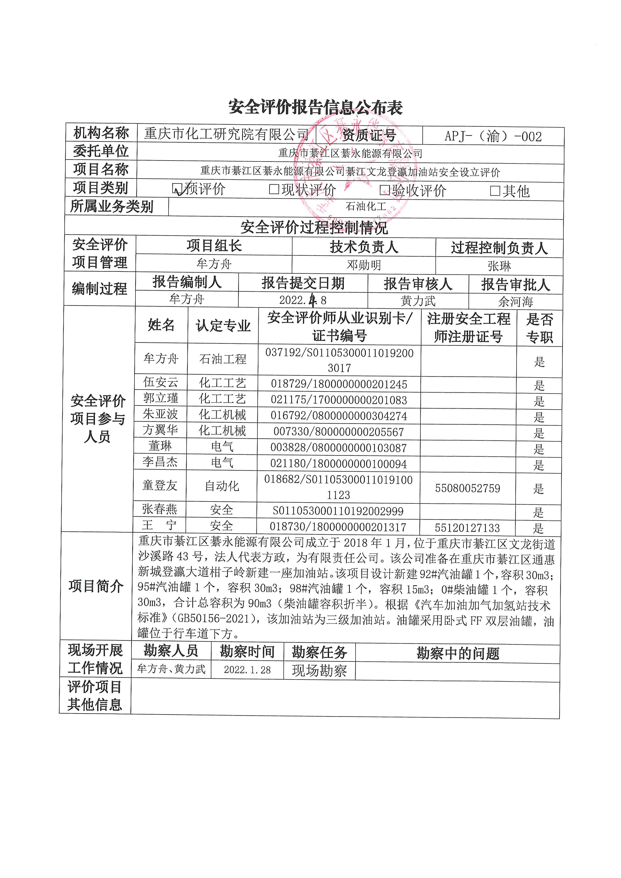 2022年第2季度 重庆市綦江区綦永能源有限公司綦江文龙登瀛加油站安全设立评价报告 信息公布表