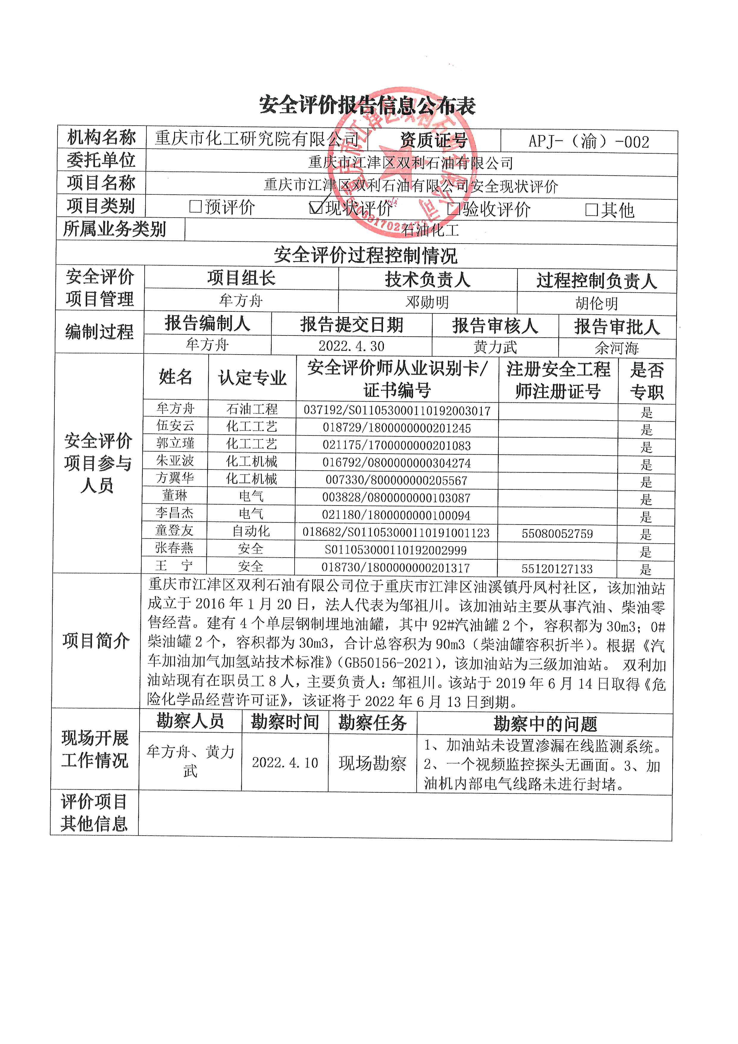 2022年第2季度 重庆市江津区双利石油有限公司安全现状评价报告 信息公布表