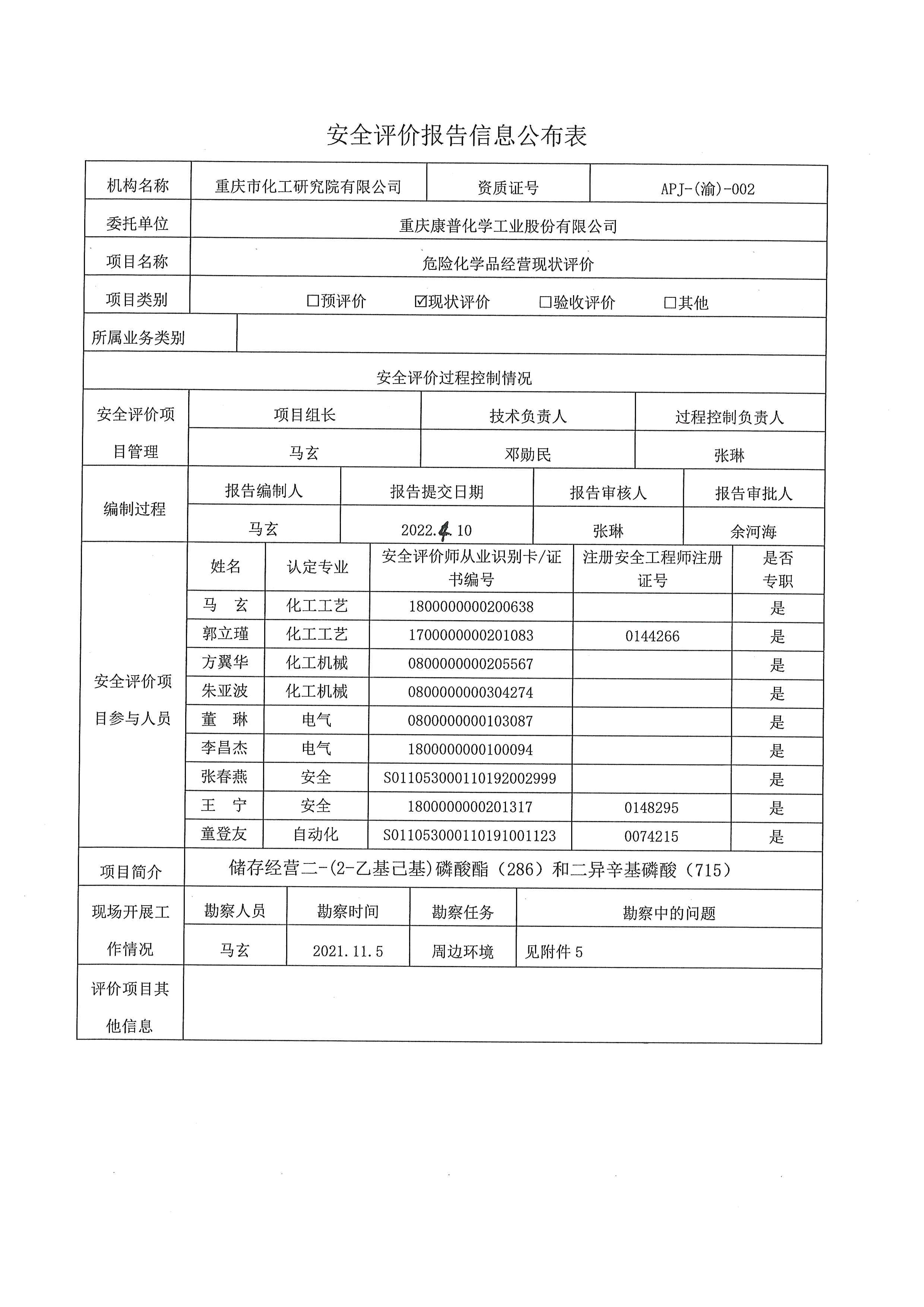 2022年第2季度 重庆康普化学工业股份有限公司危险化学品经营现状评价报告信息 公布表
