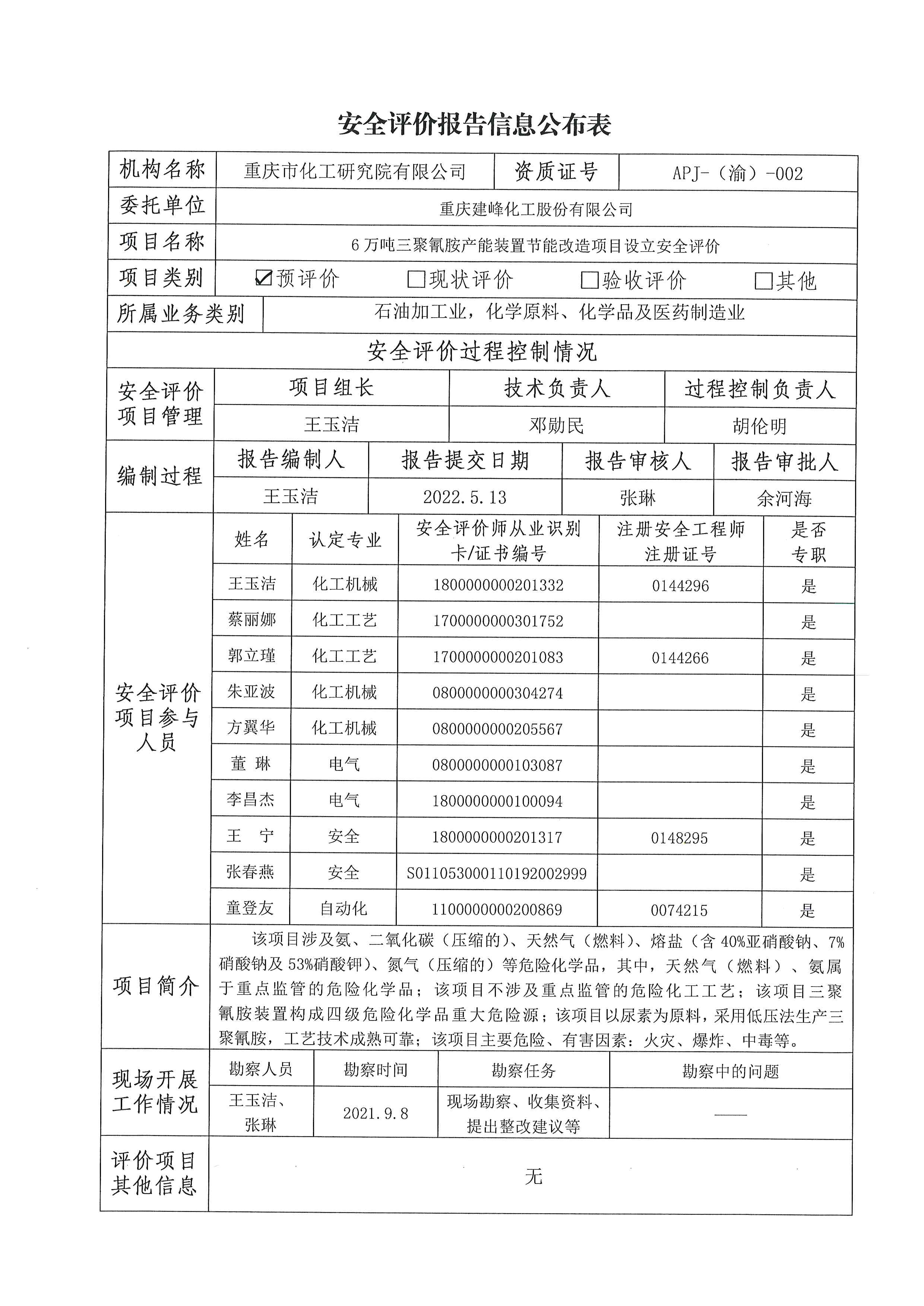 2022年第2季度 重庆建峰化工股份有限公司6万吨三聚氰胺产能装置节能改造项目设立安全评价报告 信息公布表