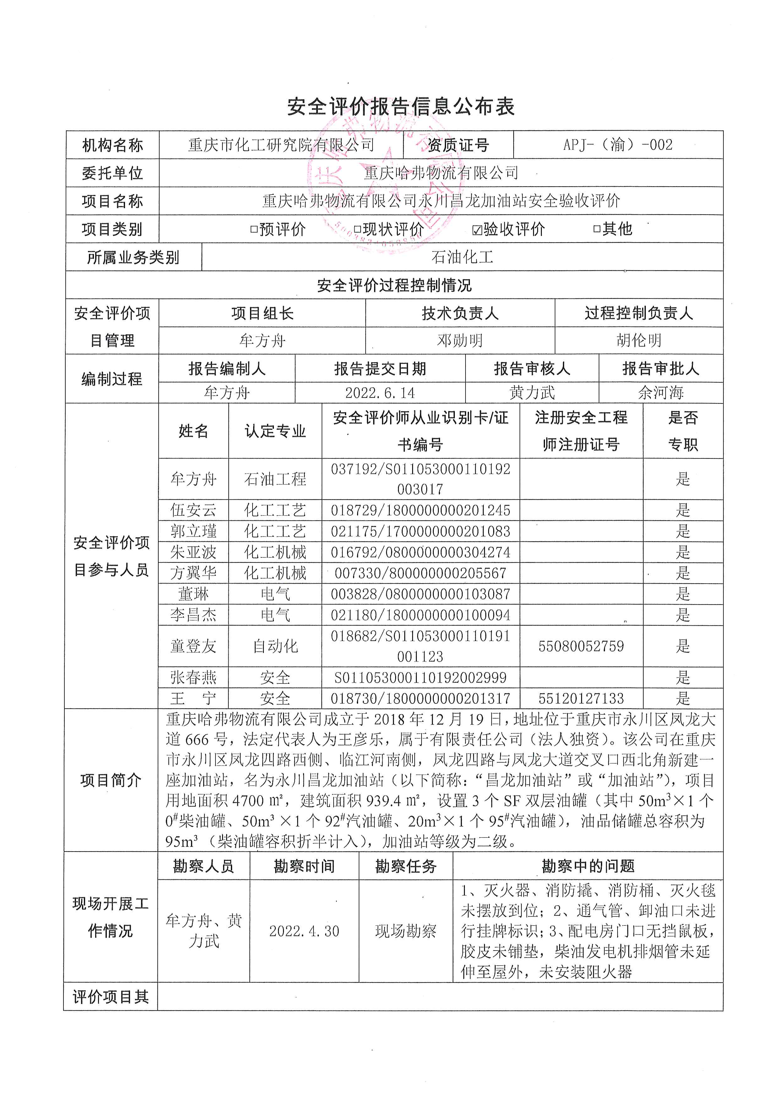 2022年第2季度 重庆哈弗物流有限公司永川昌龙加油站安全验收评价报告 信息公布表