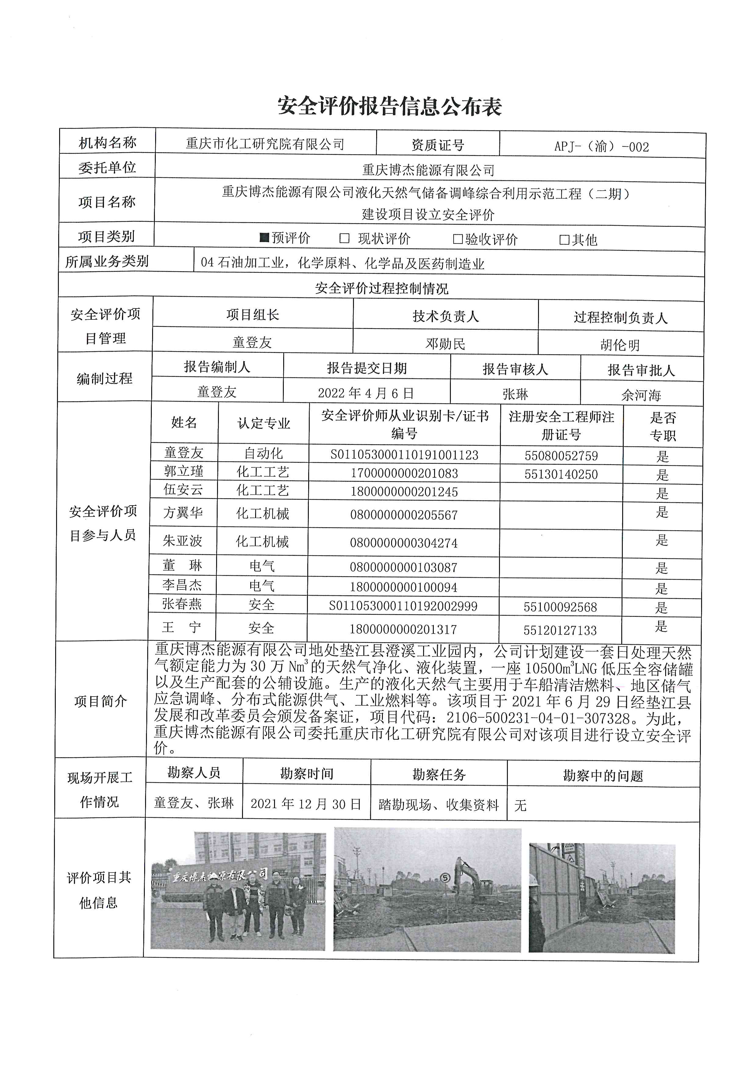 2022年第2季度 重庆博杰能源有限公司液化天然气储备调峰综合利用示范工程(二期)建设项目设立安全评价报告 信息公布表