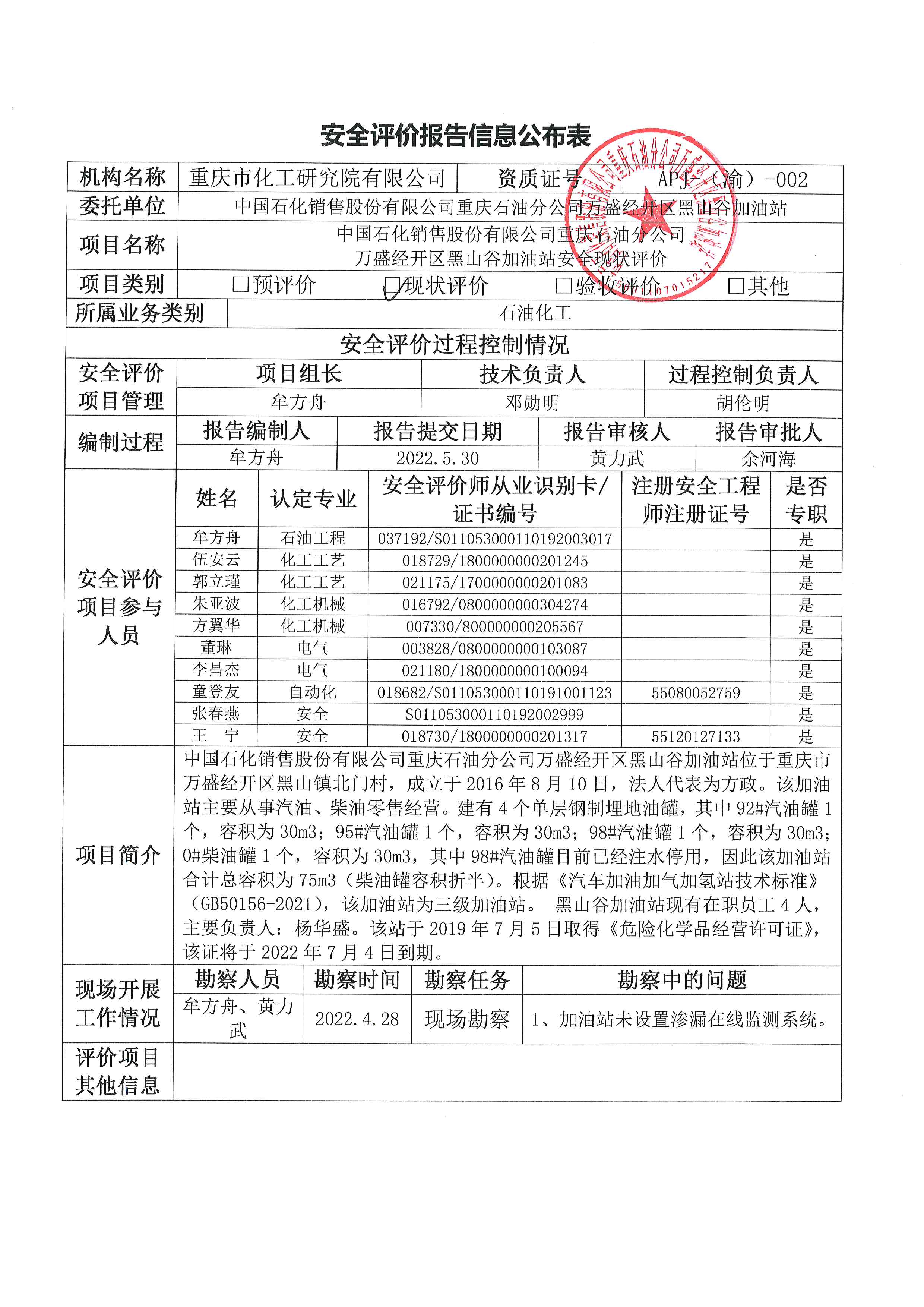 2022年第2季度 中国石化销售股份有限公司重庆石油分公司万盛经开区黑山谷加油站安全现状评价报告 信息公布表