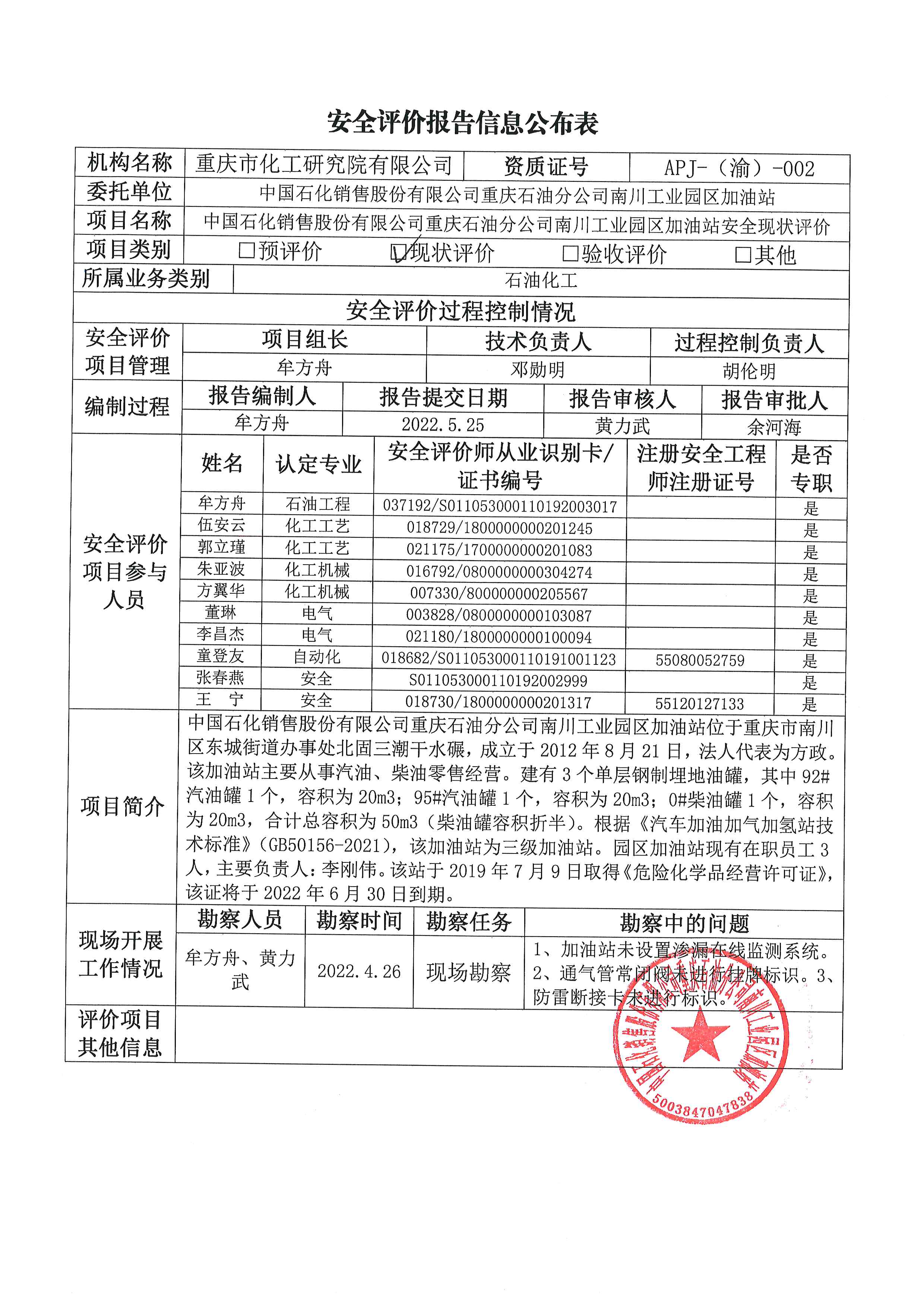 2022年第2季度 中国石化销售股份有限公司重庆石油分公司南川工业园区加油站安全现状评价报告 信息公布表