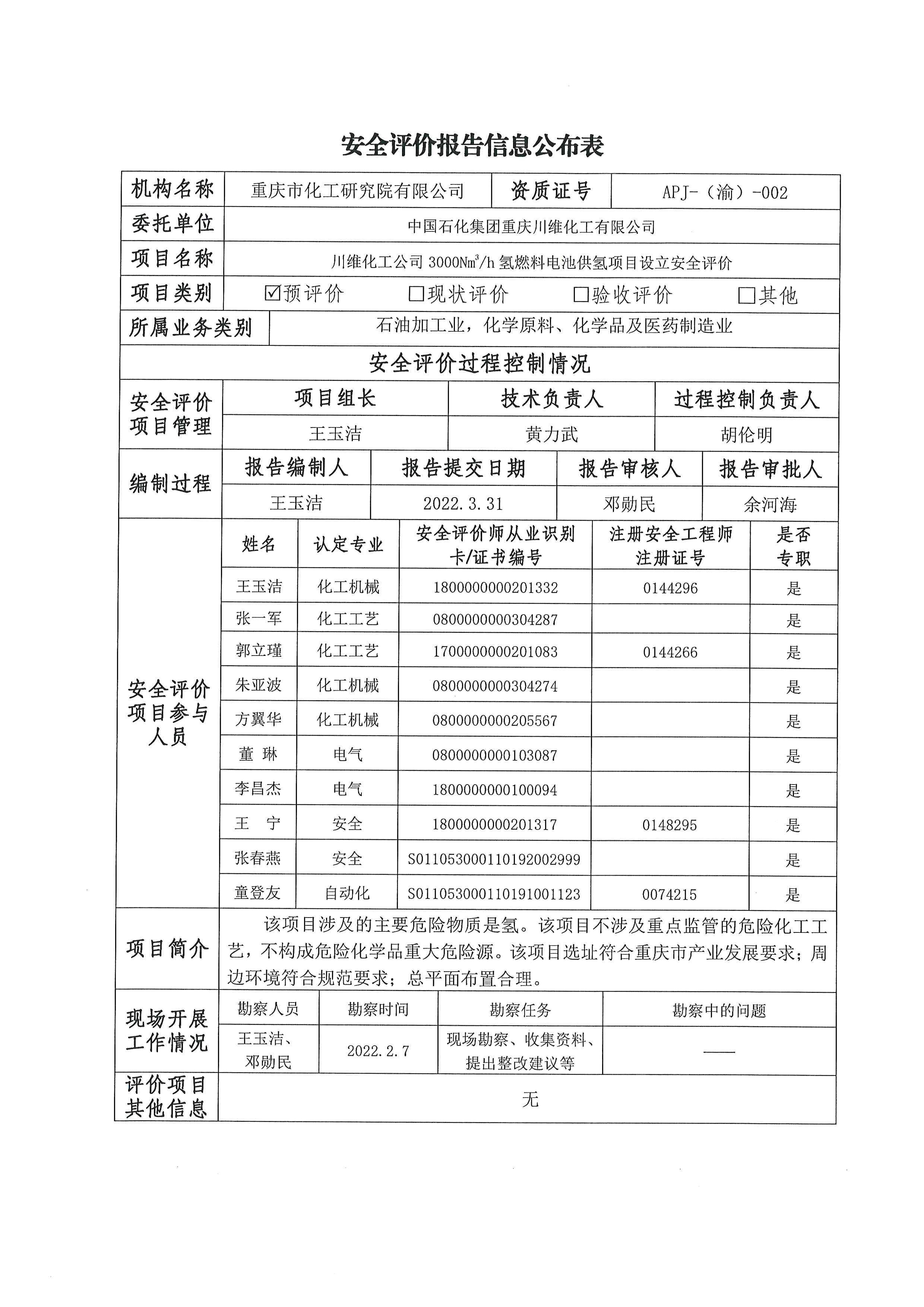 2022年第2季度 中国石化集团重庆川维化工有限公司3000Nm3h氢燃料电池供氢项目设立安全评价 信息公布表