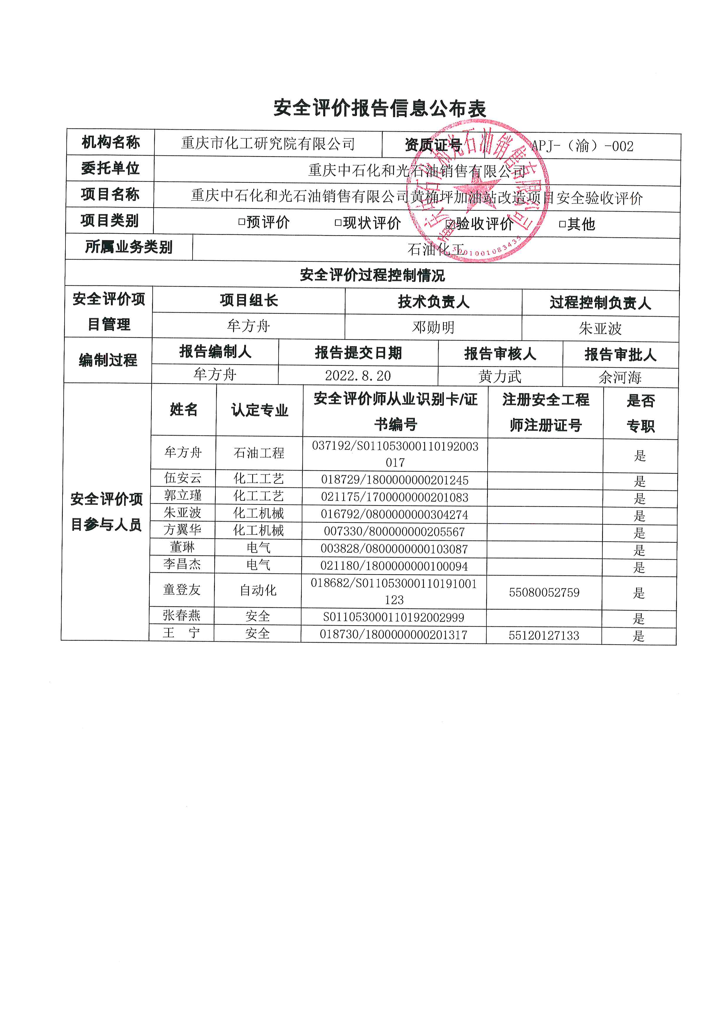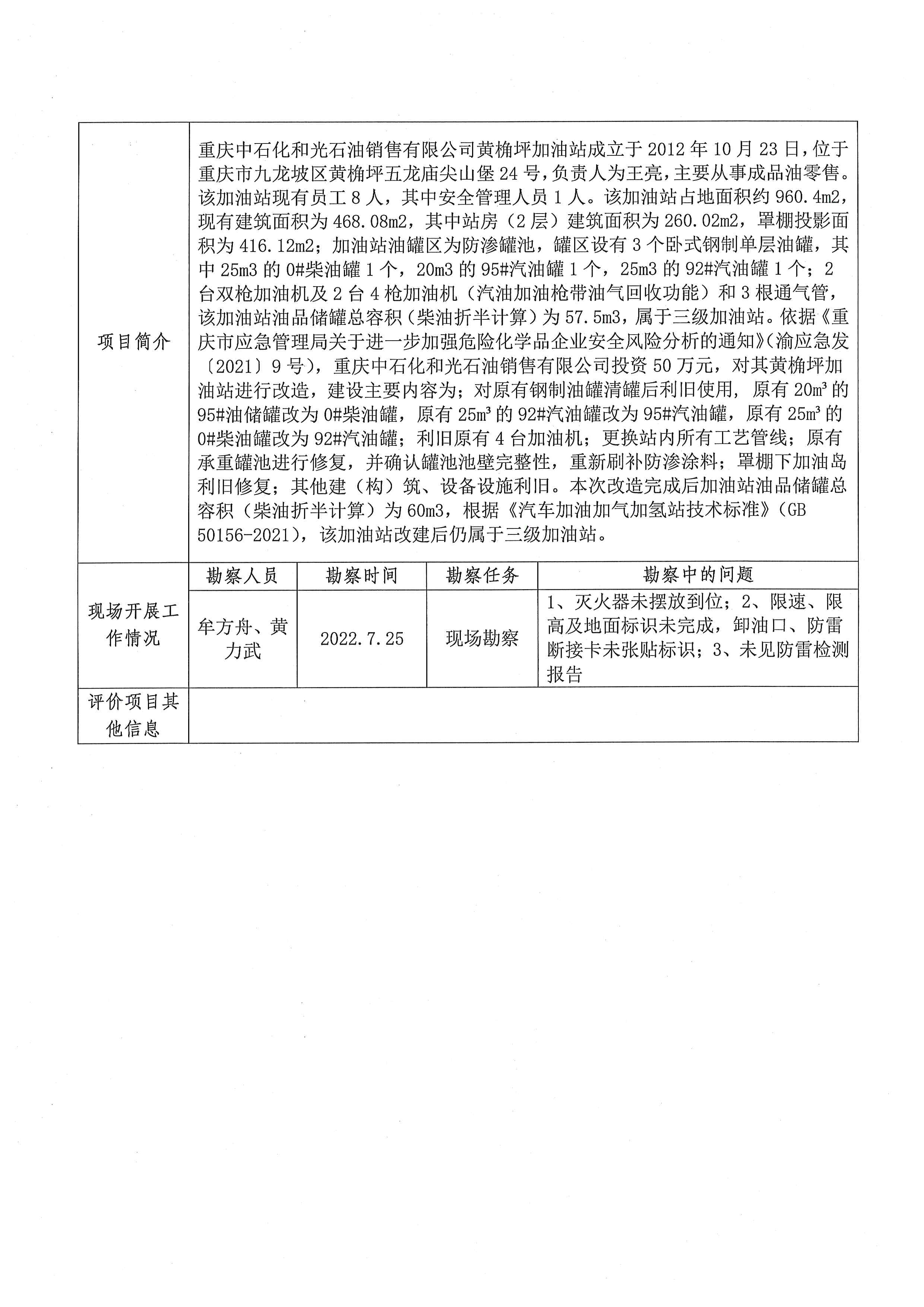 2022年第3季度 重庆中石化和光石油销售有限公司黄桷评加油站信息公布表