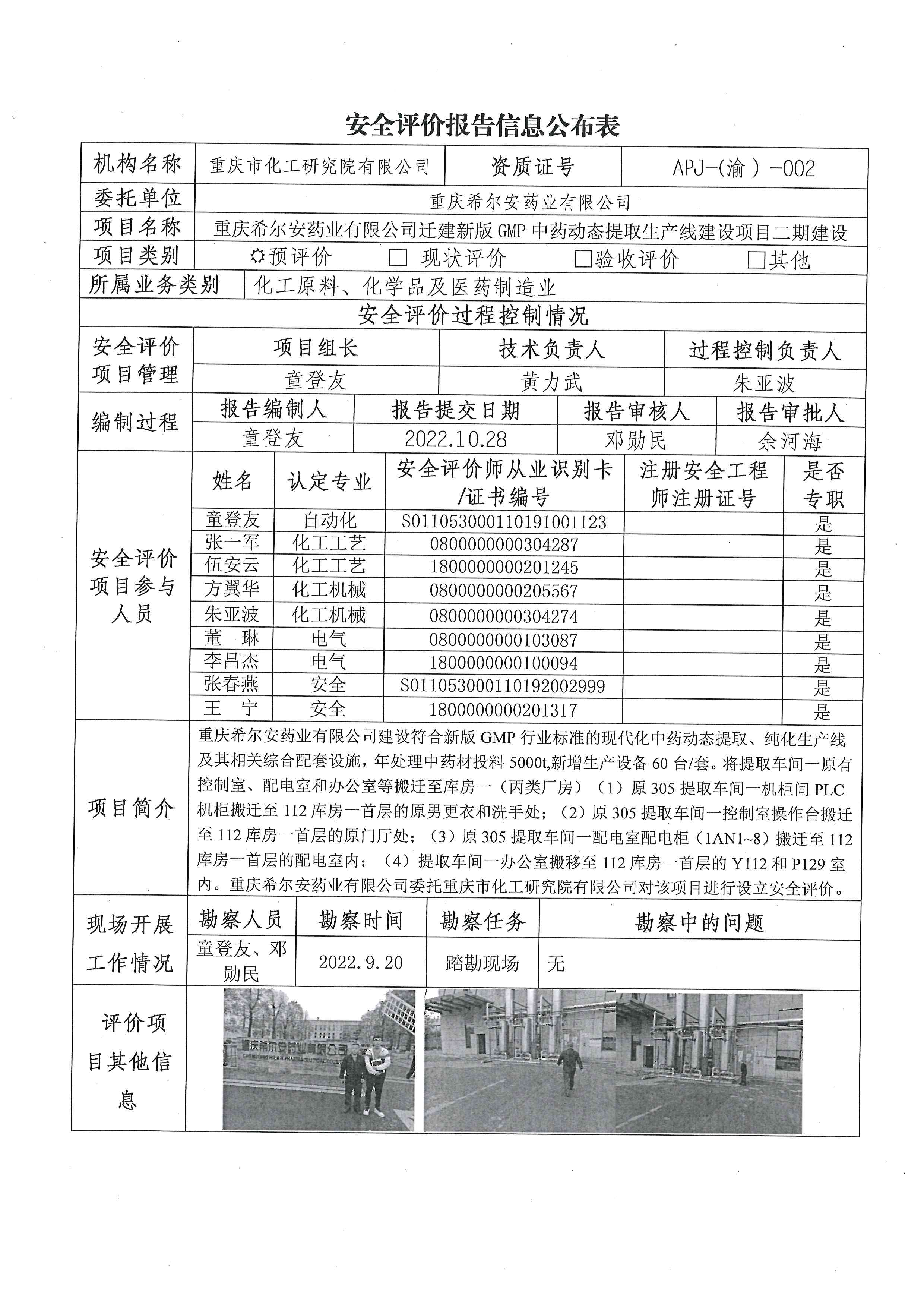 2022年4季度重庆希尔安药业有限公司迁建版GMP中药动态提取生产线建设项目二期建设立安全评价信息公布表