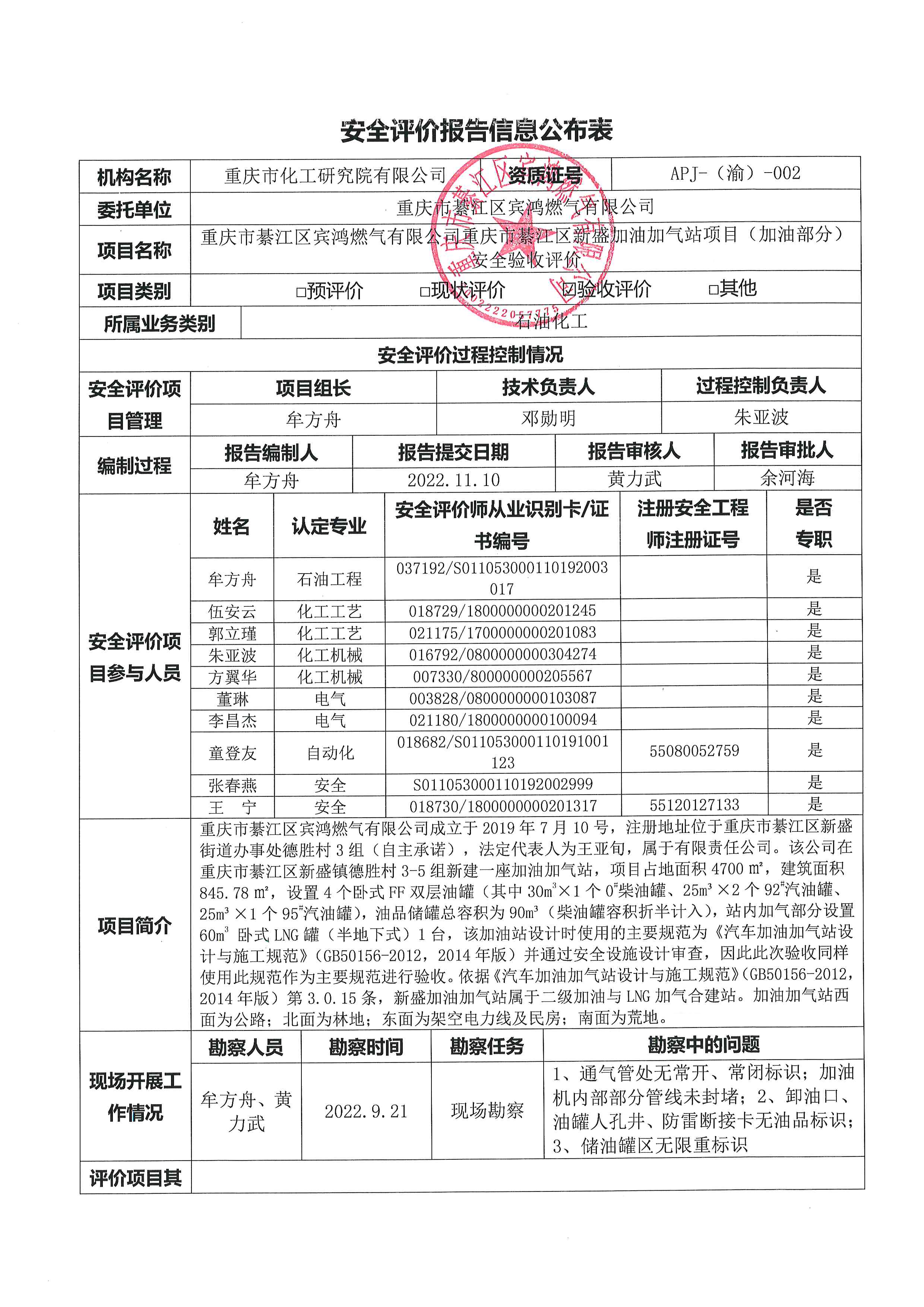 2022年4季度重庆市綦江区宾鸿燃气有限公司重庆市綦江区新盛加油站项目(加气部分)安全现状评价信息公布表