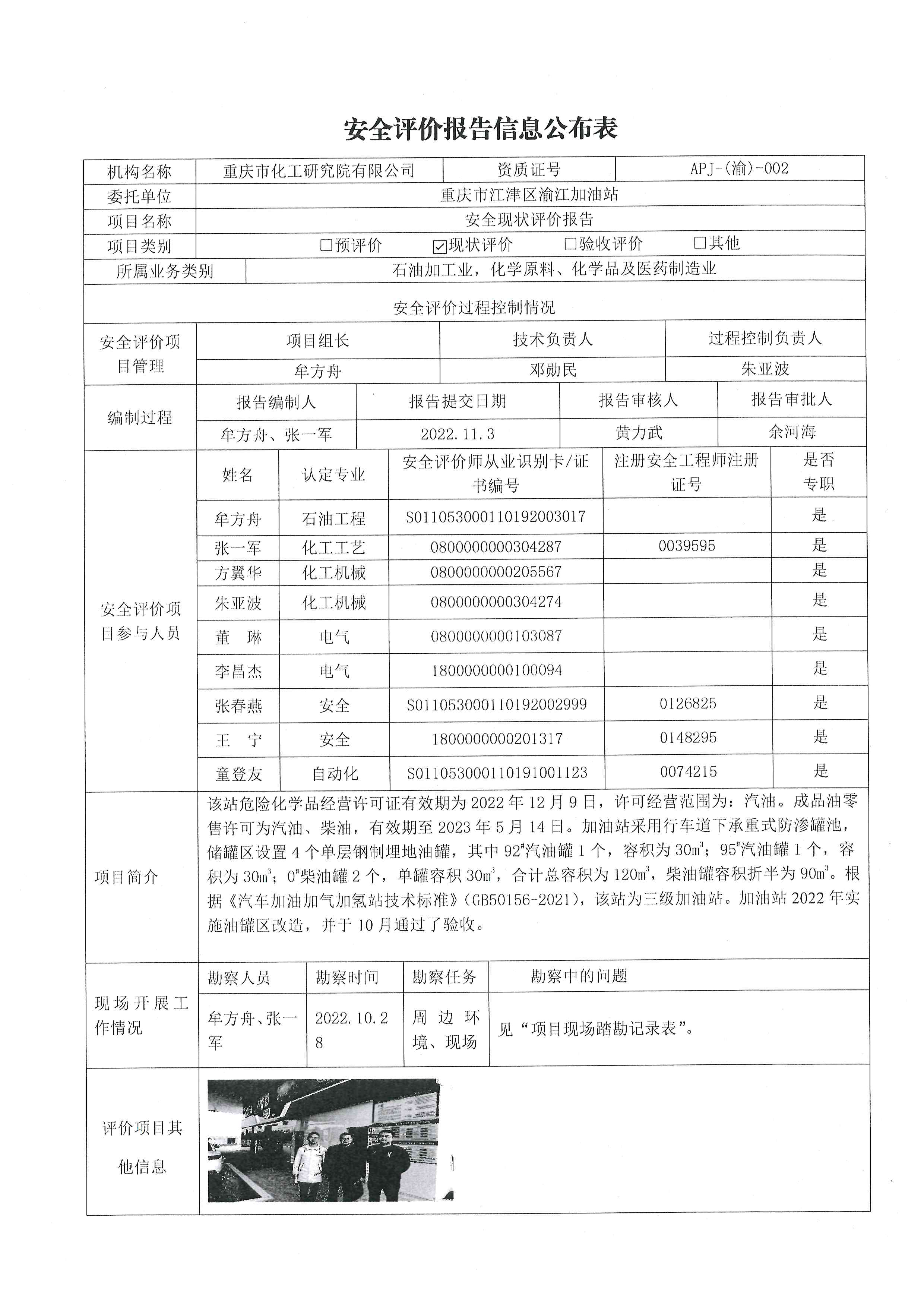 2022年4季度重庆市江津区渝江加油站安全现状评价信息公布表
