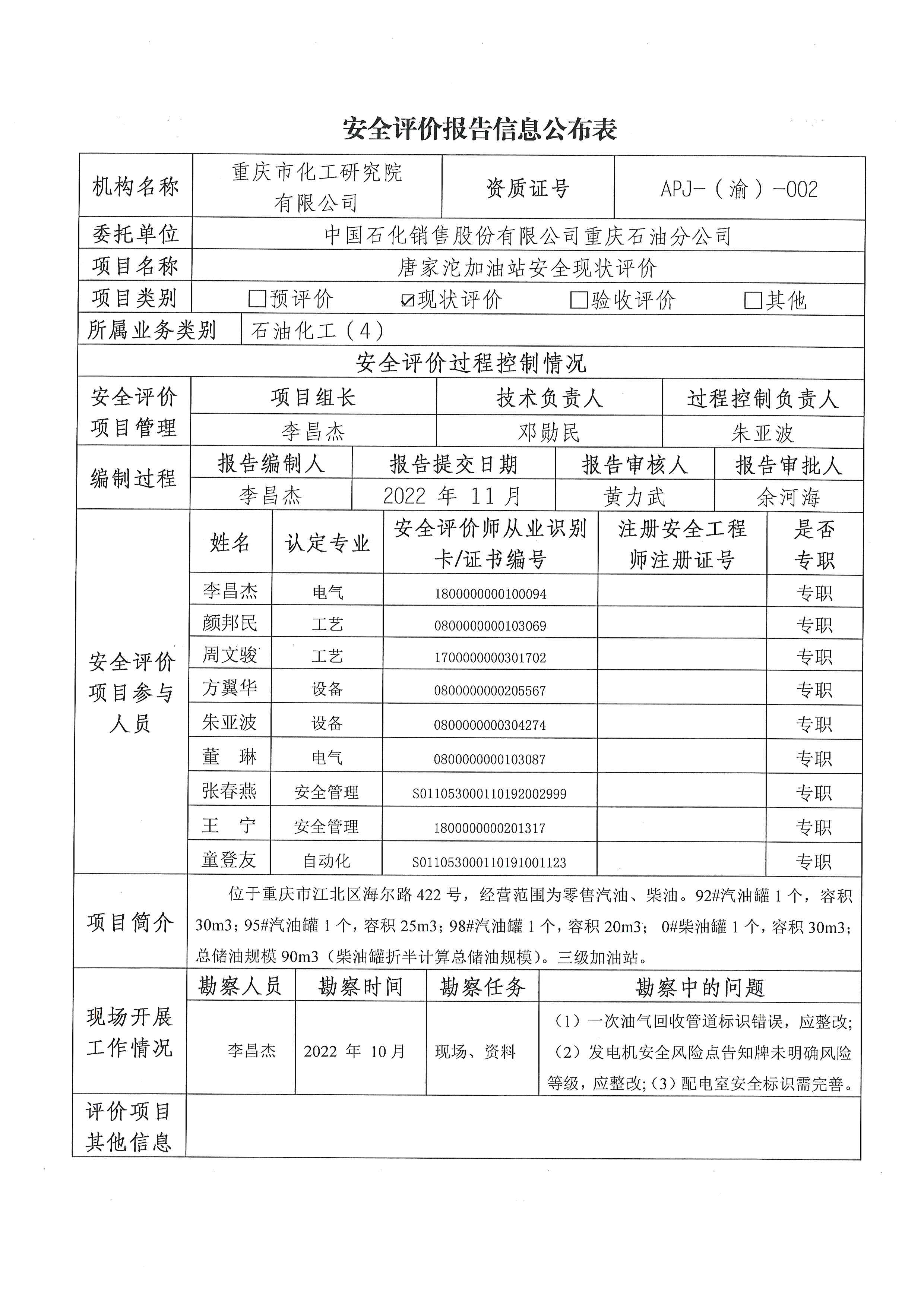2022年4季度重庆石油分公司唐家沱加油站安全现状评价信息公布表