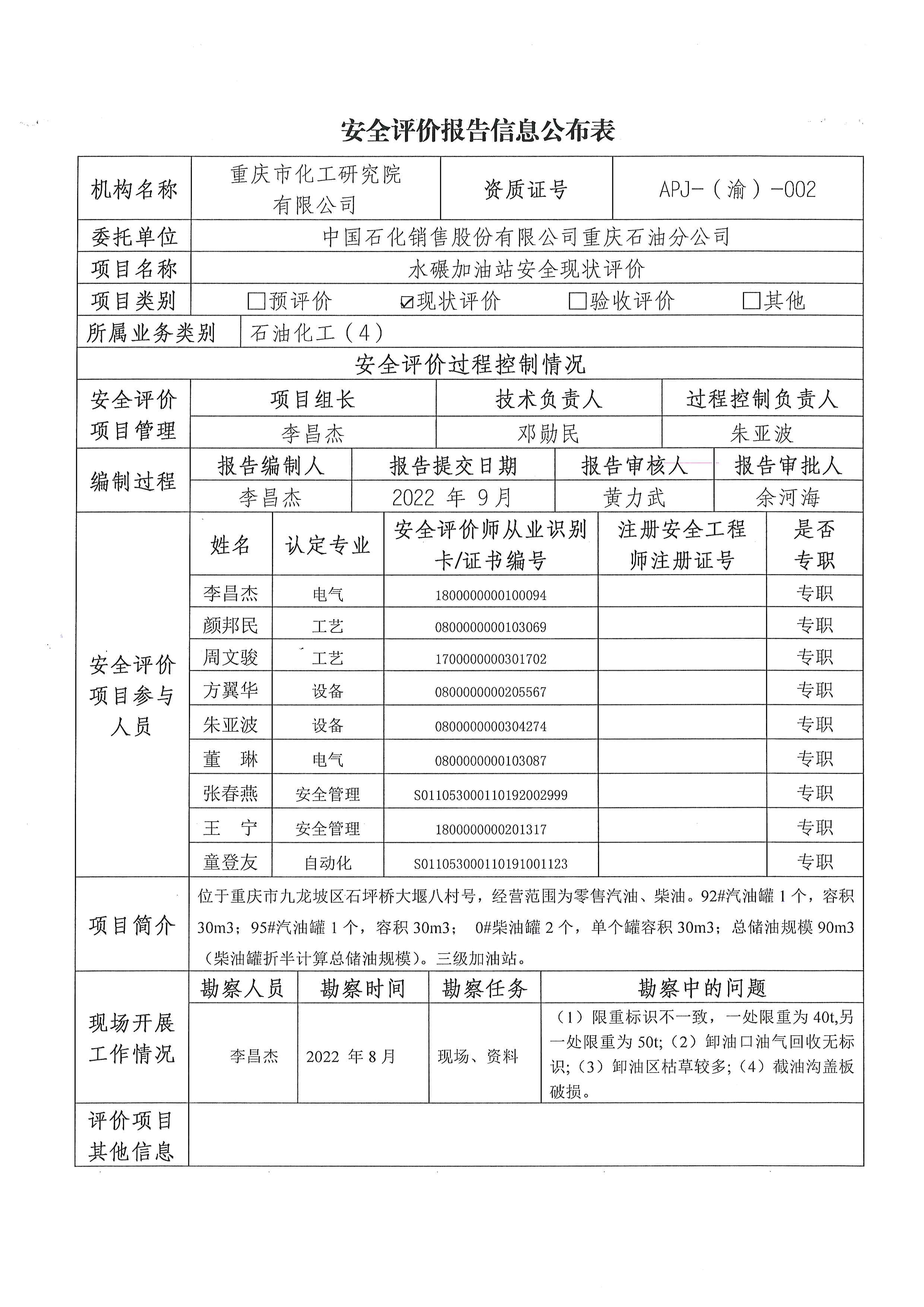 2022年4季度重庆石油分公司水碾加油站安全现状评价信息公布表