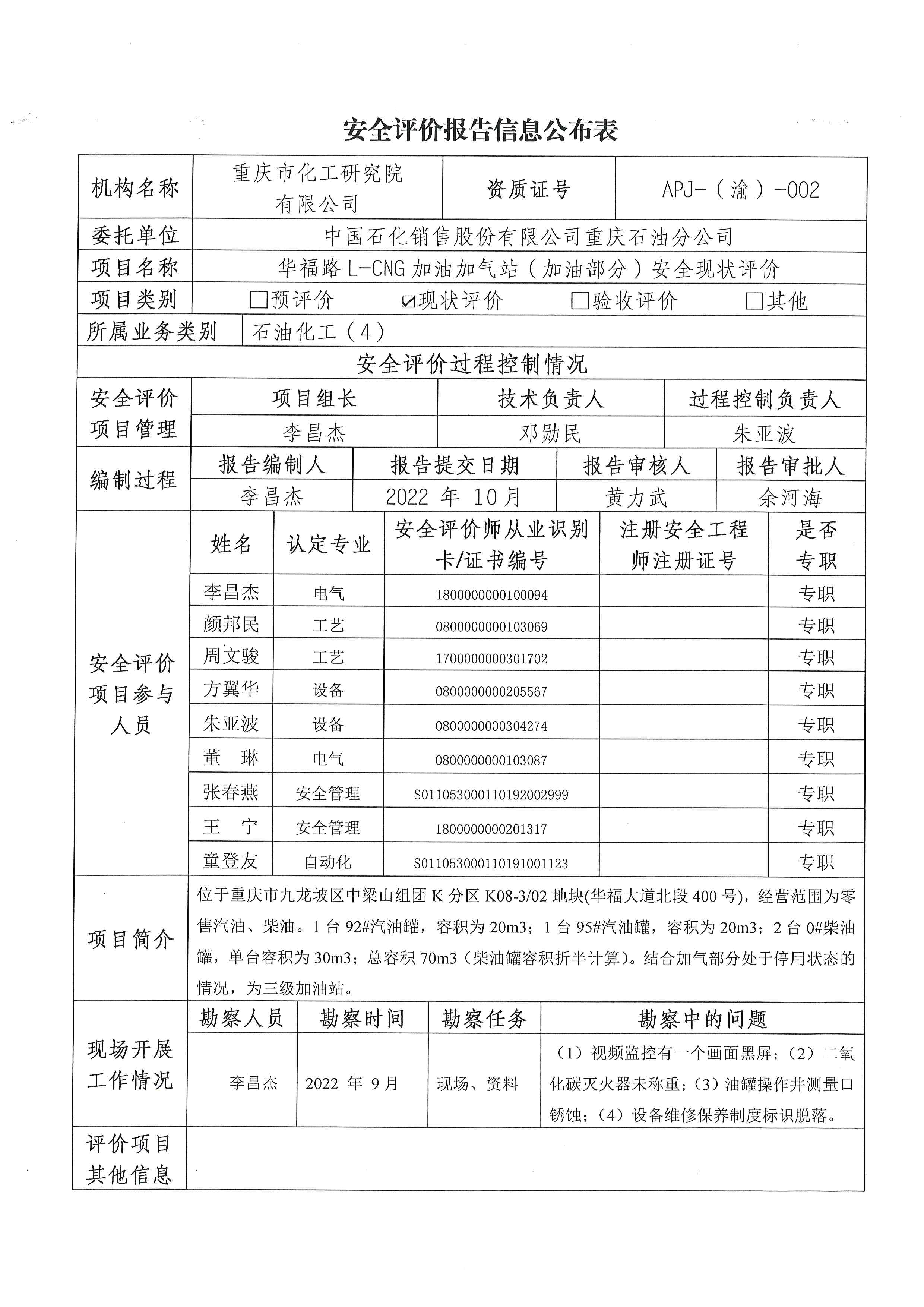 2022年4季度重庆石油分公司华福路L-CNG加油加气站安全现状评价信息公布表