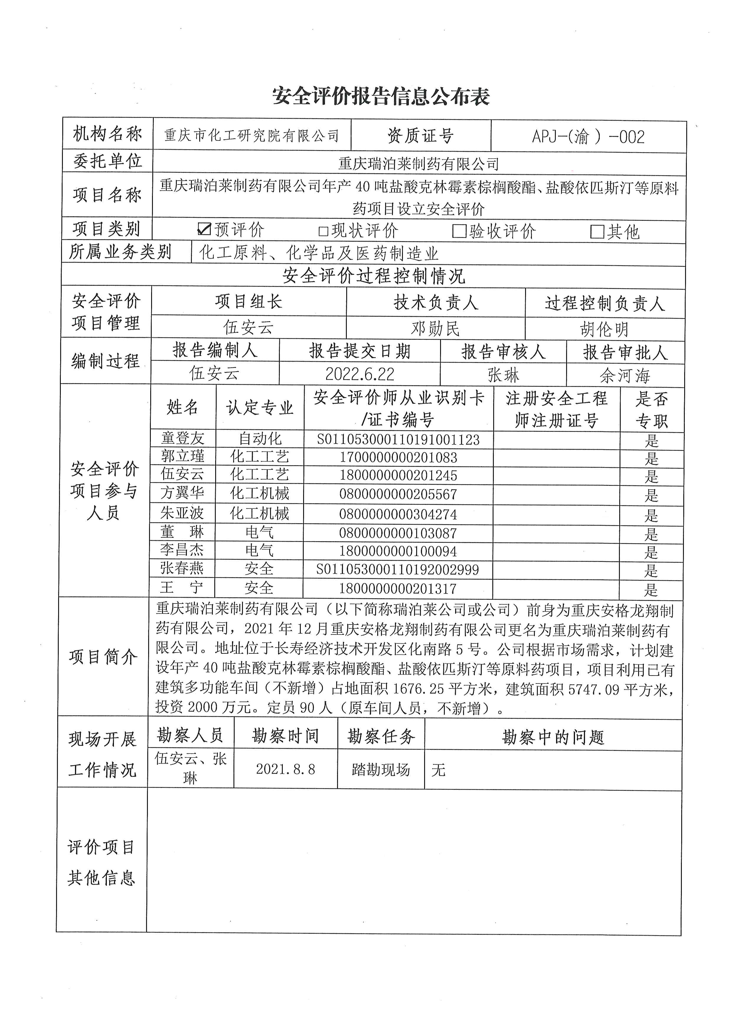 2022年4季度重庆瑞泊莱制药有限公司年产40万吨盐酸克林霉素棕榈酸酯项目设立安全评价信息公布表
