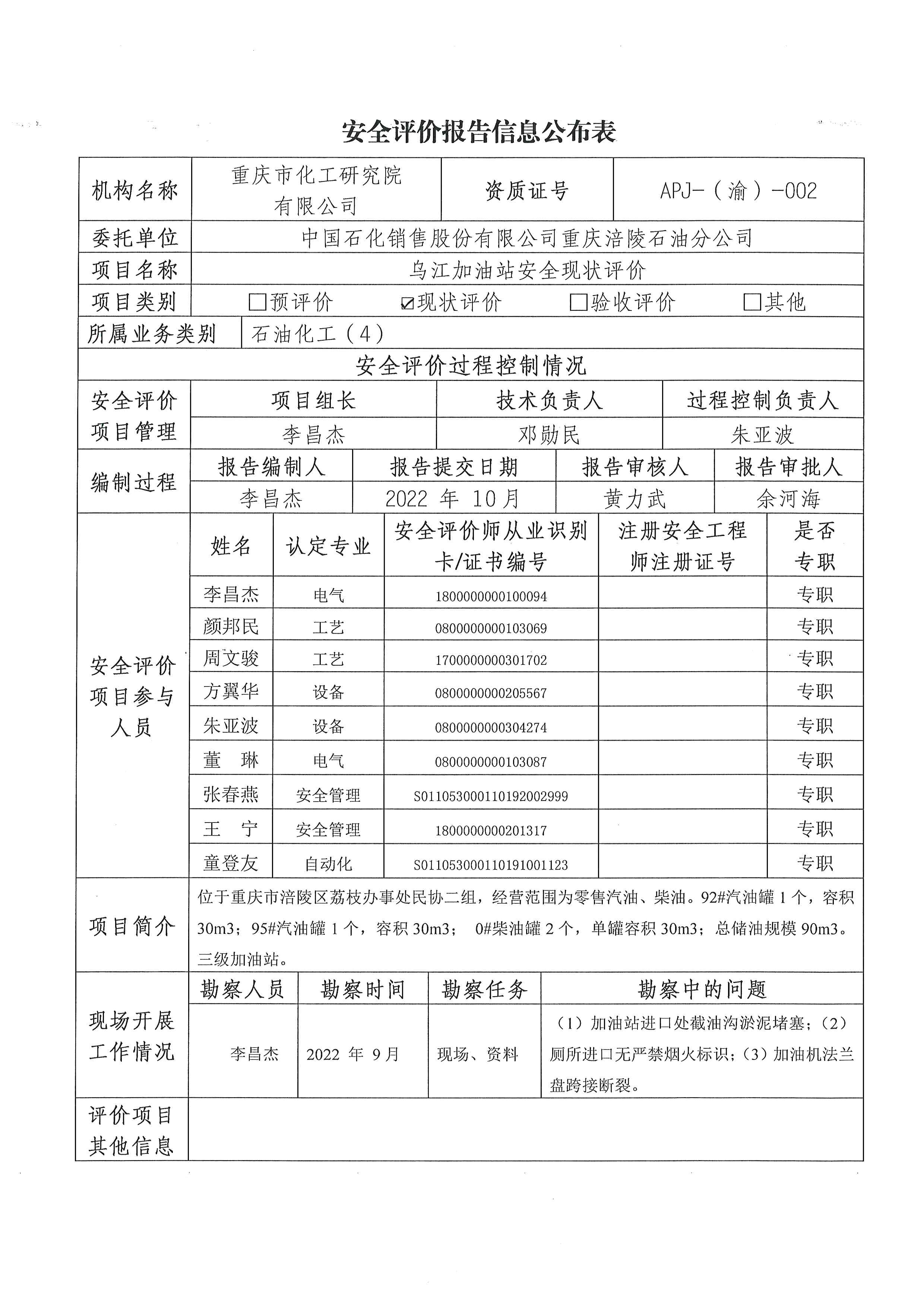 2022年4季度重庆涪陵石油分公司乌江加油站安全现状评价信息公布表