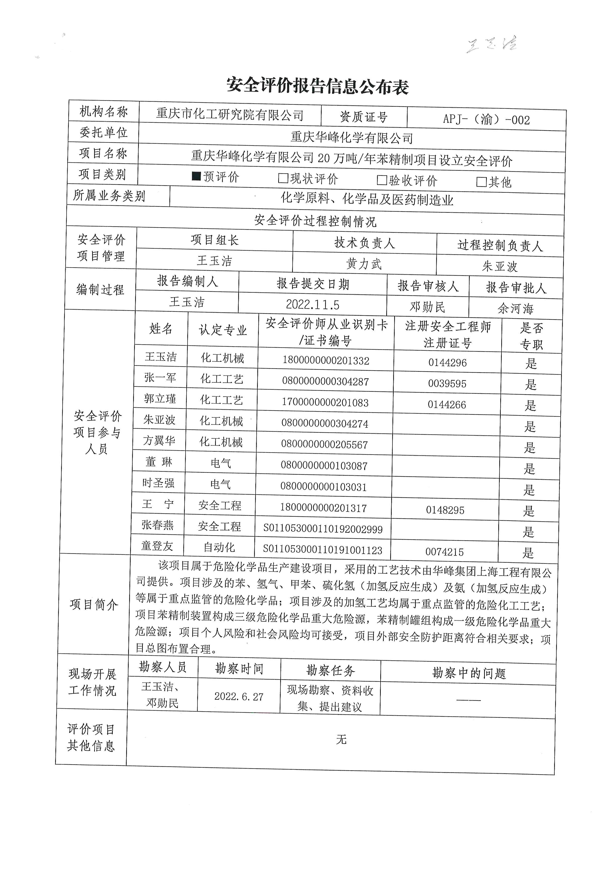 2022年4季度重庆华峰化学有限公司20万吨、年苯精制项目设立安全评价信息公布表