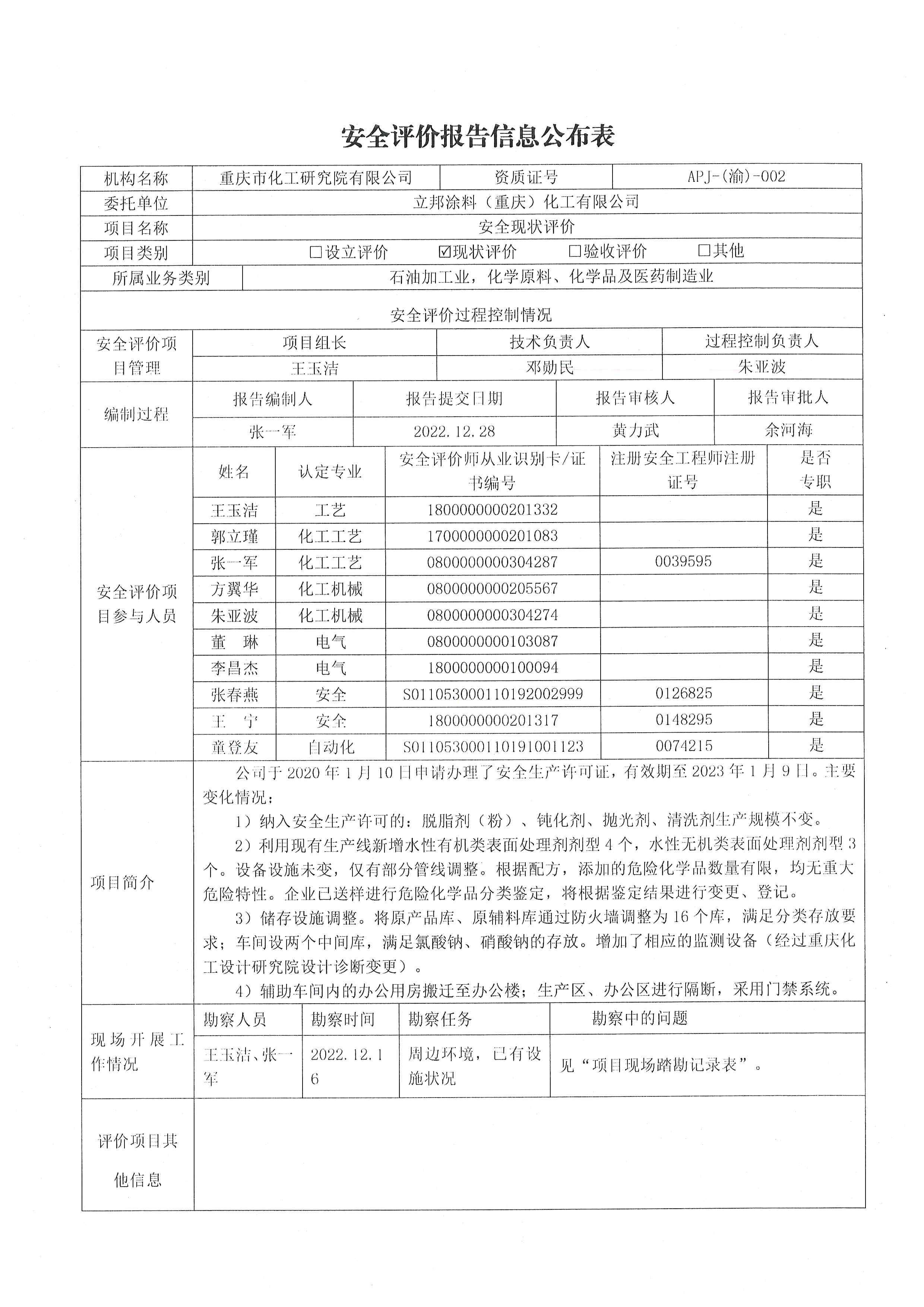 2022年4季度立邦涂料(重庆)化工有限公司安全现状评价信息公布表