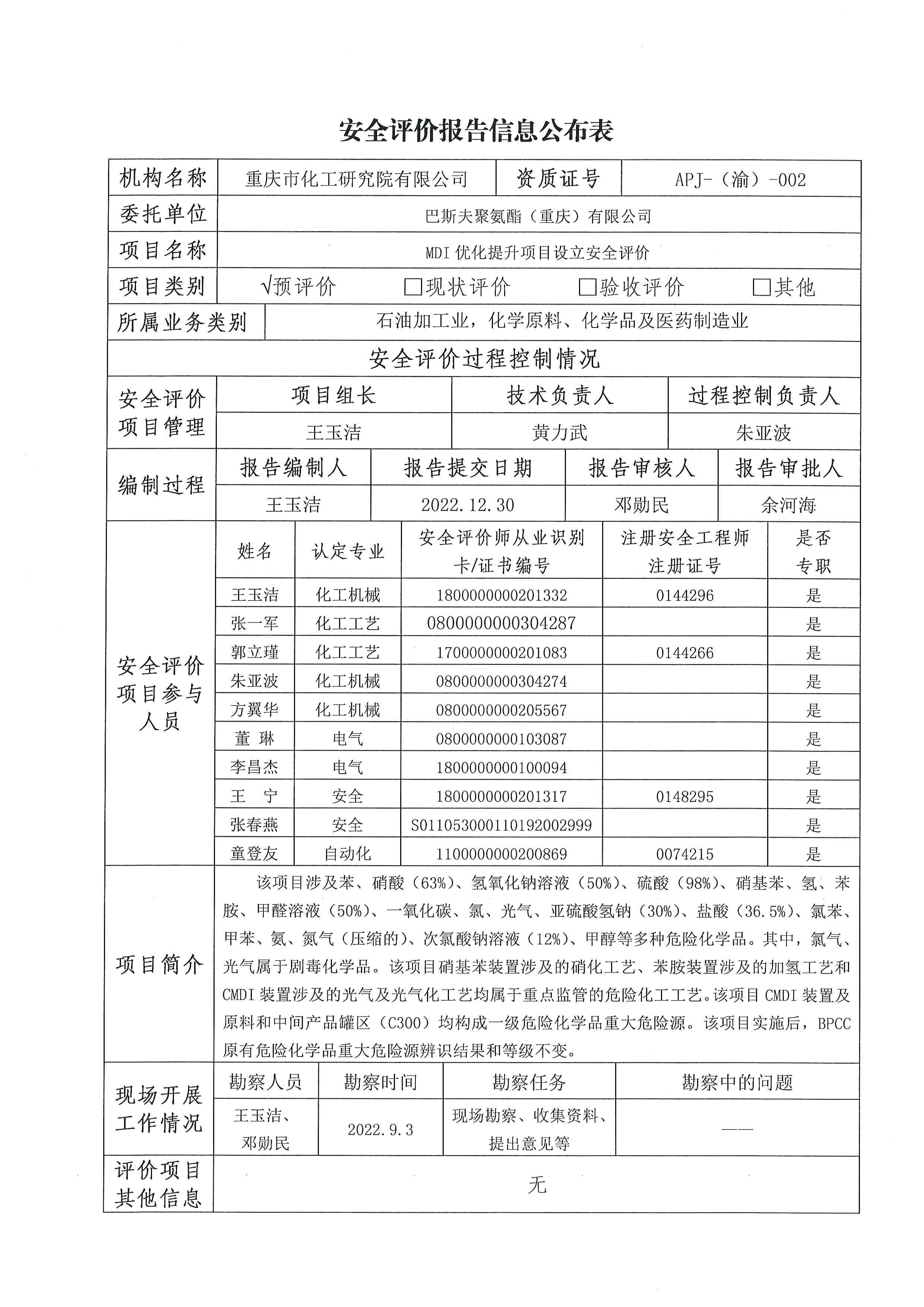2023年1季度巴斯夫聚氨酯(重庆)有限公司MDI优化提升项目安全评价报告信息公布表