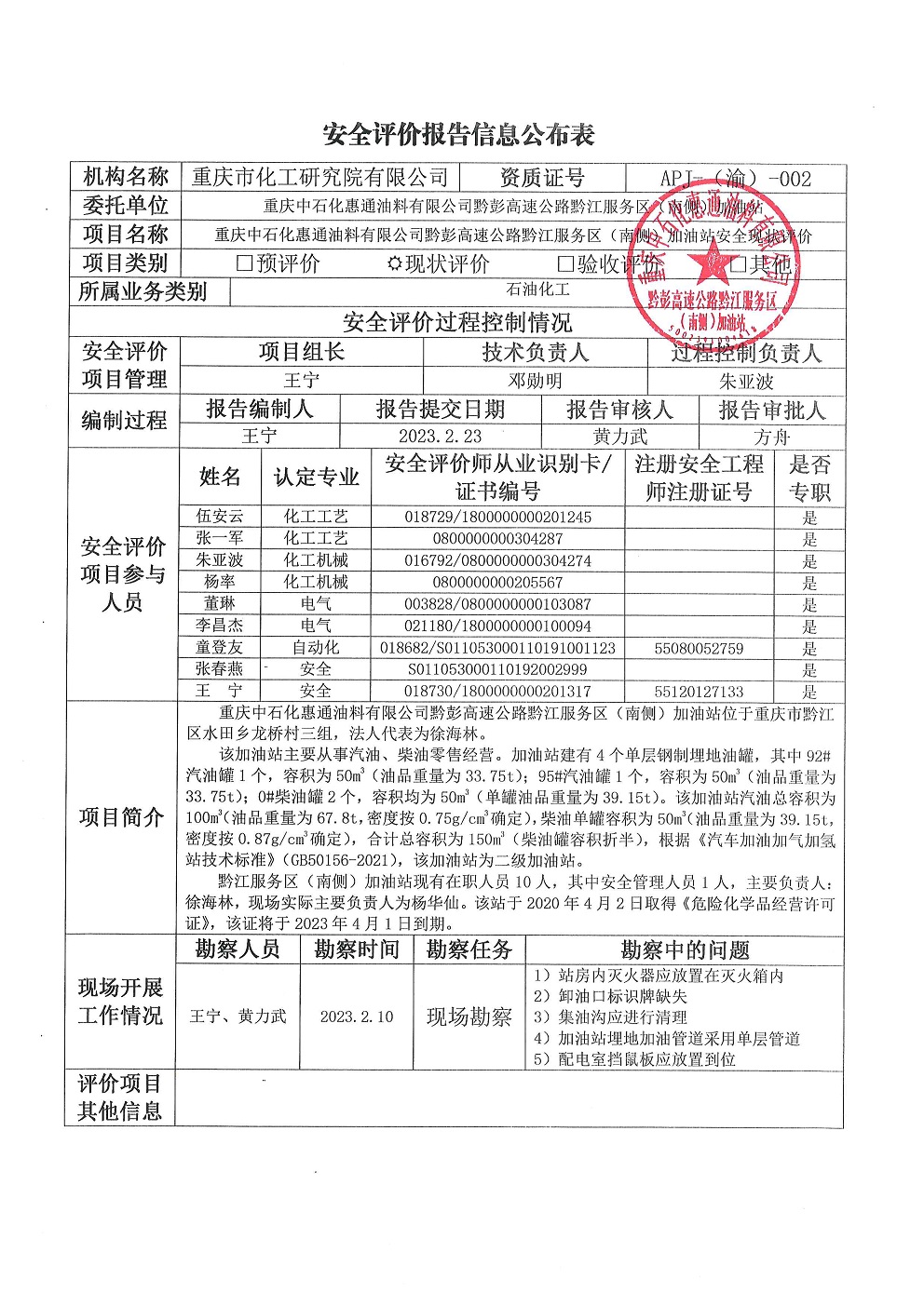 2023年1季度中石化惠通油料有限公司黔江服务区加油站(南侧)安全评价报告信息公布表