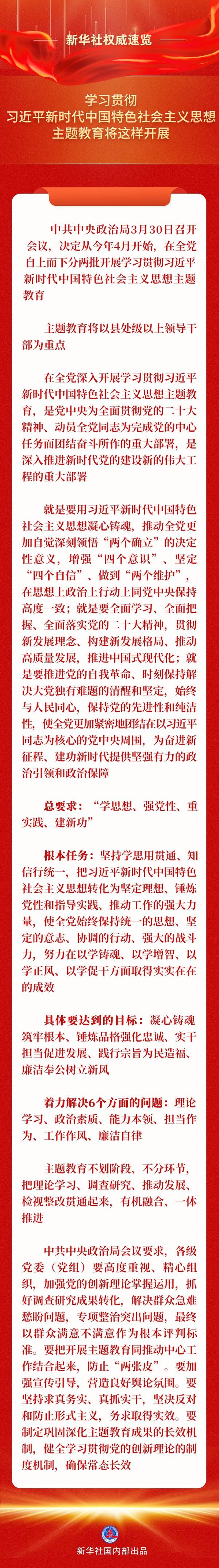 中共中央政治局3月30日召开会议,决定从今年4月开始,在全党自上而下分两批开展学习贯彻习近平新时代中国特色社会主义思想主题教育。