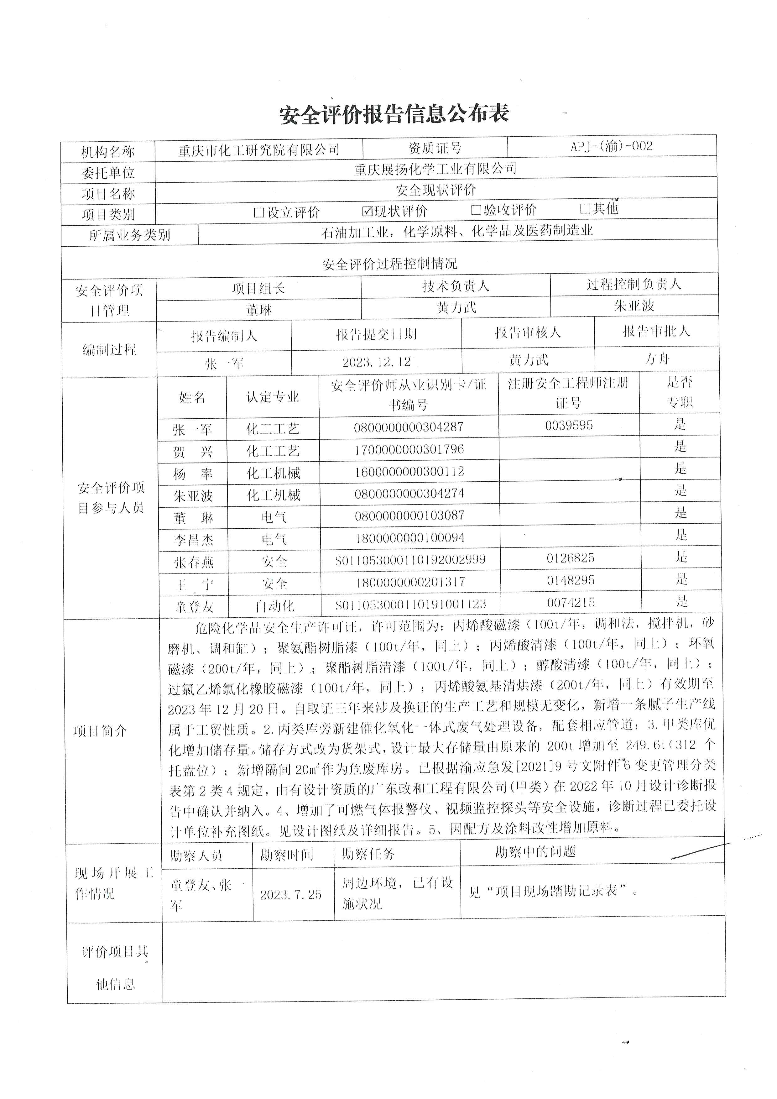 2023年4季度重庆展扬化学工业有限公司安全评价报告信息公布表