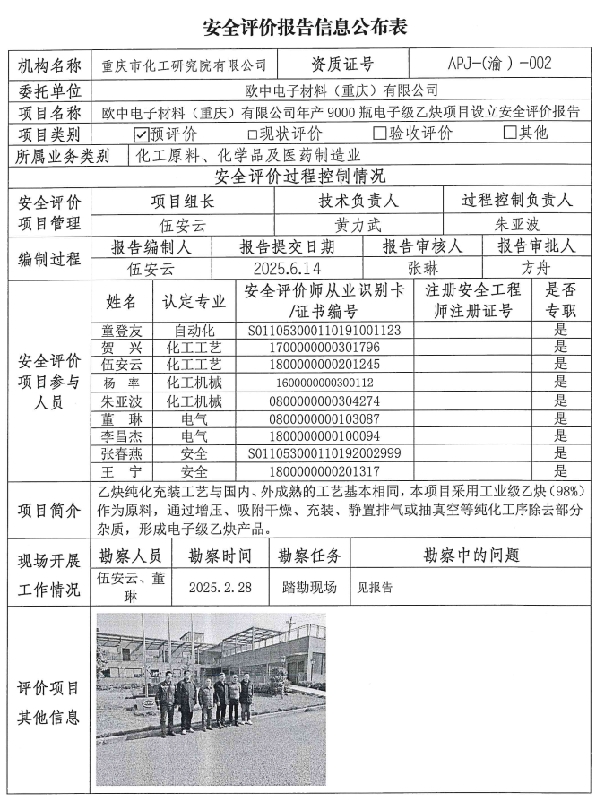 2025年第4季度欧中电子材料(重庆)有限公司年产9000瓶电子级乙炔项目设立评价信息公布表及附现场图片现场图片