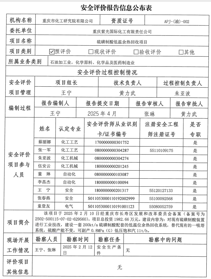 2025年第4季度重庆紫光国际化工有限责任公司硫磺制酸低温余热回收项目设立安全评价信息公布表及附现场图片