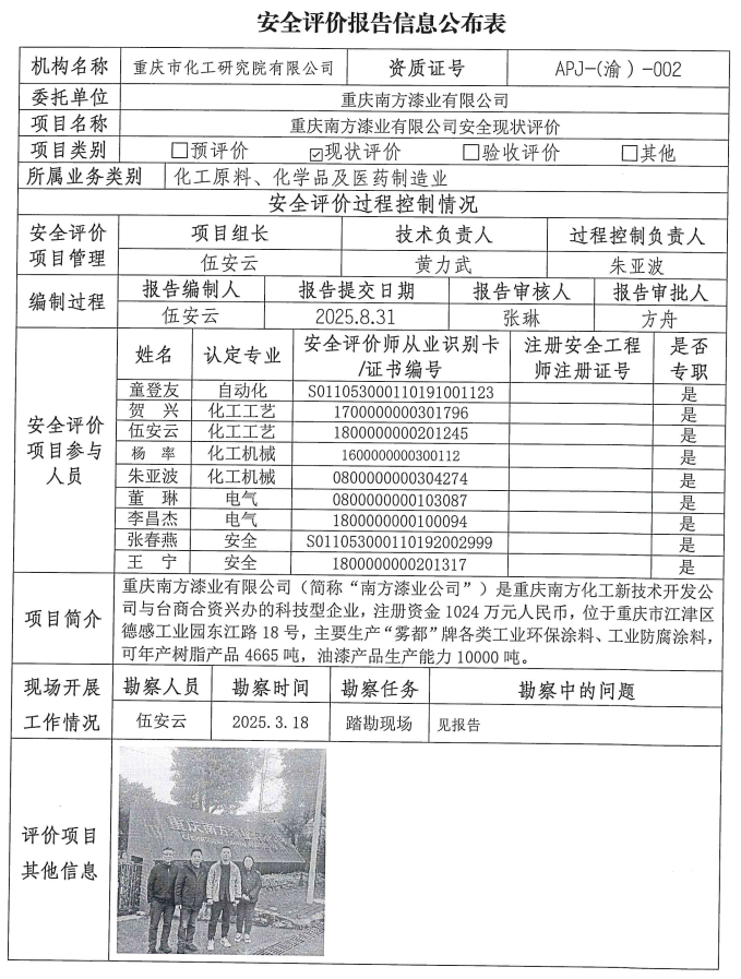 2025年第4季度重庆南方漆业有限公司安全现状信息公布表及现场图片