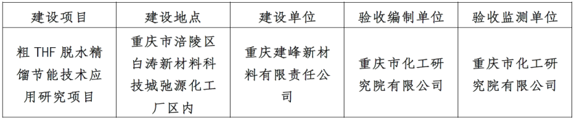 根据《国务院关于修改〈建设项目竣工环境保护管理条例〉的决定》国务院令第682,以及生产环境部《关于发布<建设项目竣工环境保护验收暂行办法>的公告》国环规环评20174,现将重庆建峰新材料有限责任公司THF脱水精馏节能技术应用研究项目竣工环境保护验收公示如下